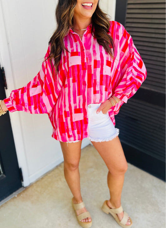 Geometric Lace Buttoned Decor Long Sleeve Blouse