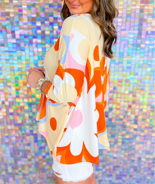 Ribbed Floral Printed Shirred 3/4 Sleeve Blouse