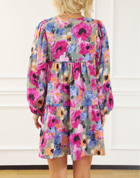 Floral Tie Neck Bubble Sleeve Shift Dress