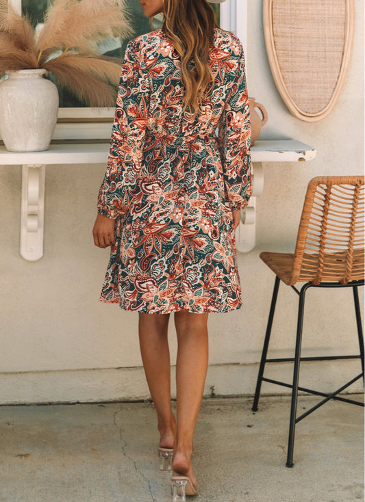 Geometric Print Long Sleeve Surplice Flowy Dress