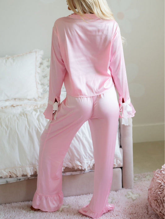 Satin Knot Accent Shirt and Ruffled Pants Lounge Set