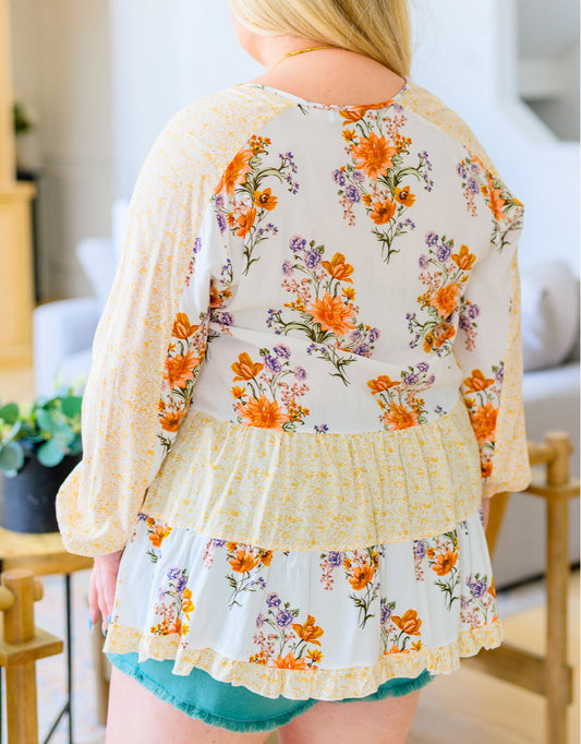 Plus Size Floral Print V Neck Puff Sleeve Blouse