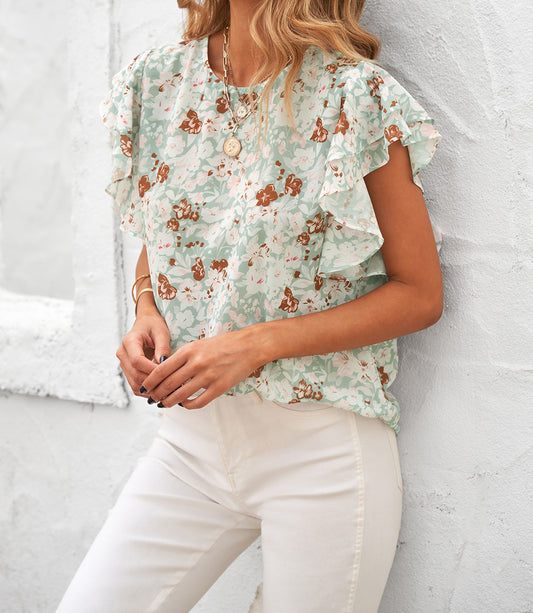 Floral Ruffle Crew Neck Short Sleeve Top