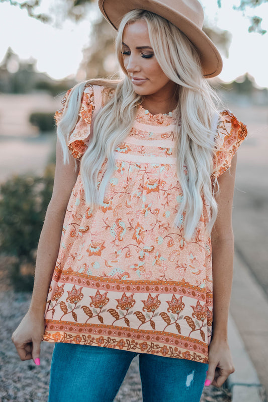Floral Print Ruffled Crew Neck Sleeveless Top
