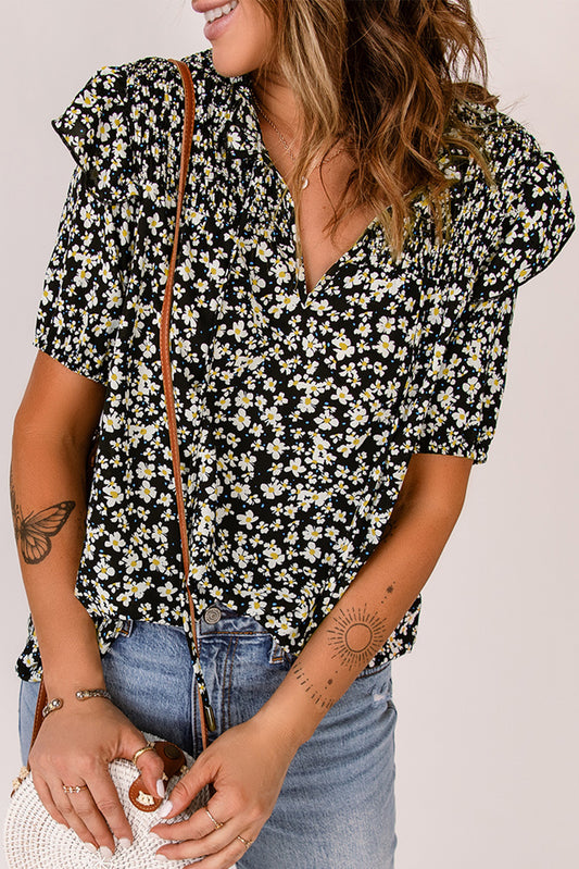 Floral Print Smocked Ruffled V Neck T-shirt