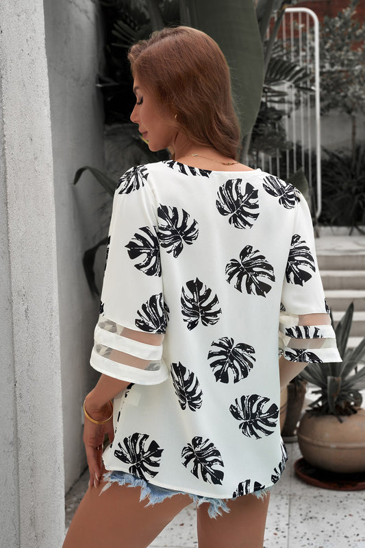 V Neck Mesh Splicing Sleeve Palm Leaf Print Top