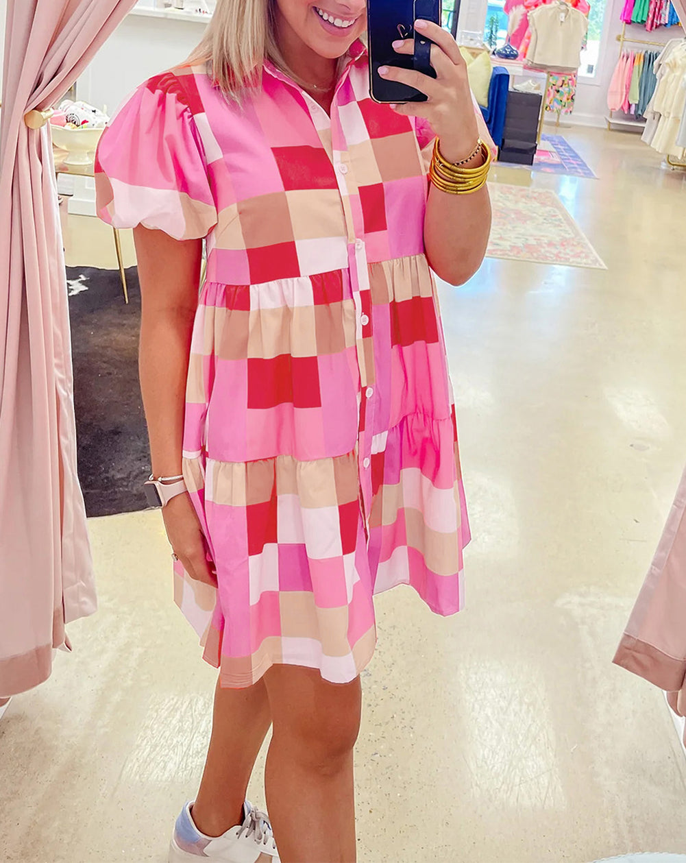Plaid Print Puff Sleeve Buttoned Tiered Dress
