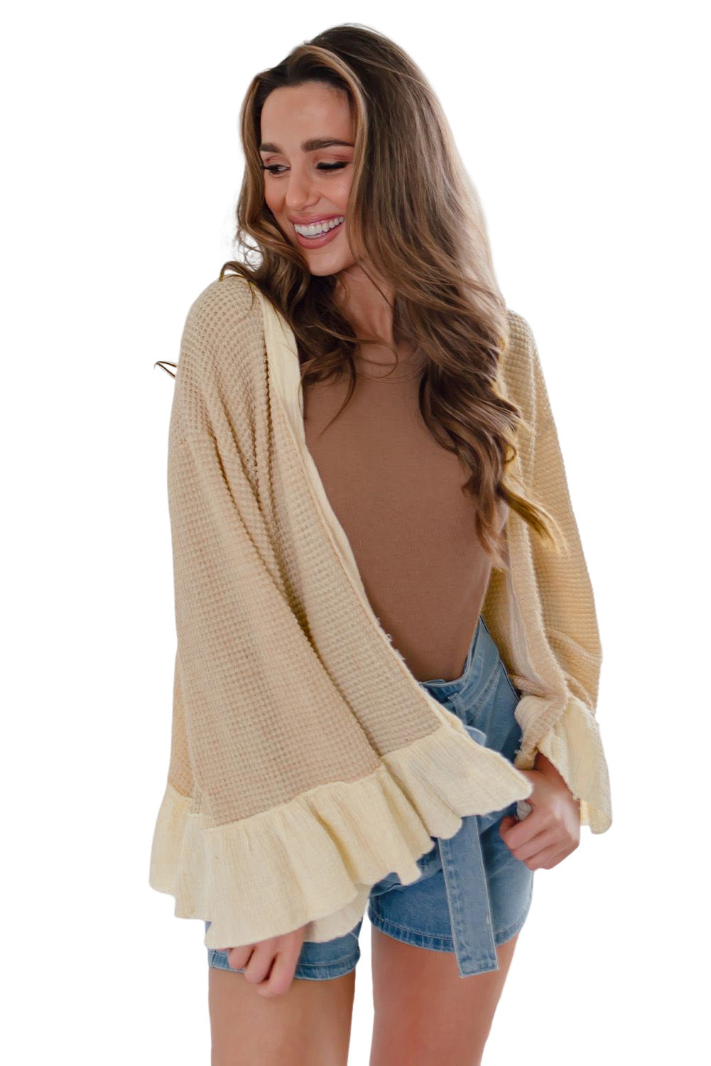 Apricot Waffle Knit Bell Sleeve Ruffled Open Front Cardigan