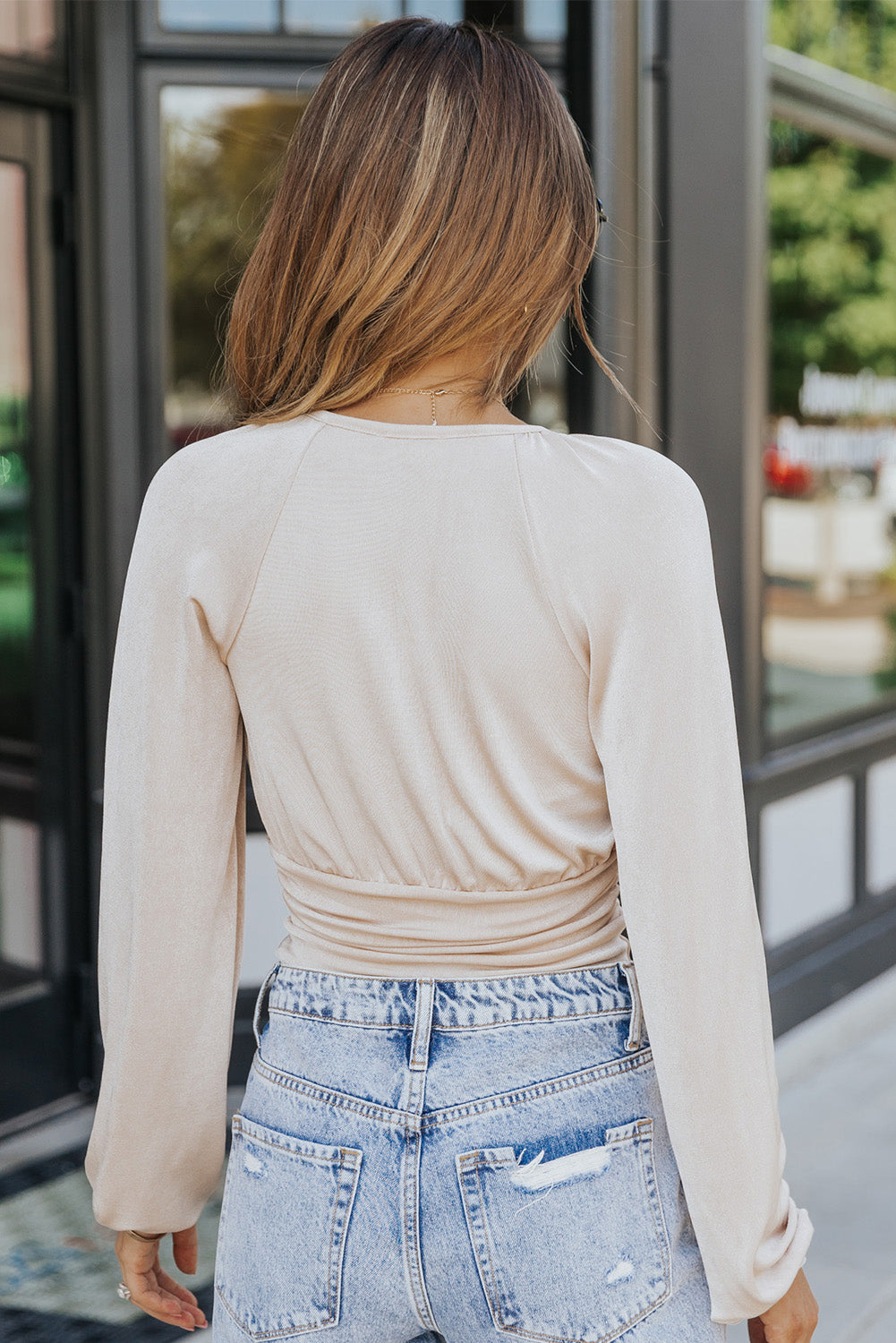 Beige Deep V Neck Ruched Puff Sleeve Bodysuit