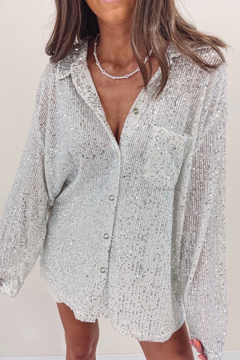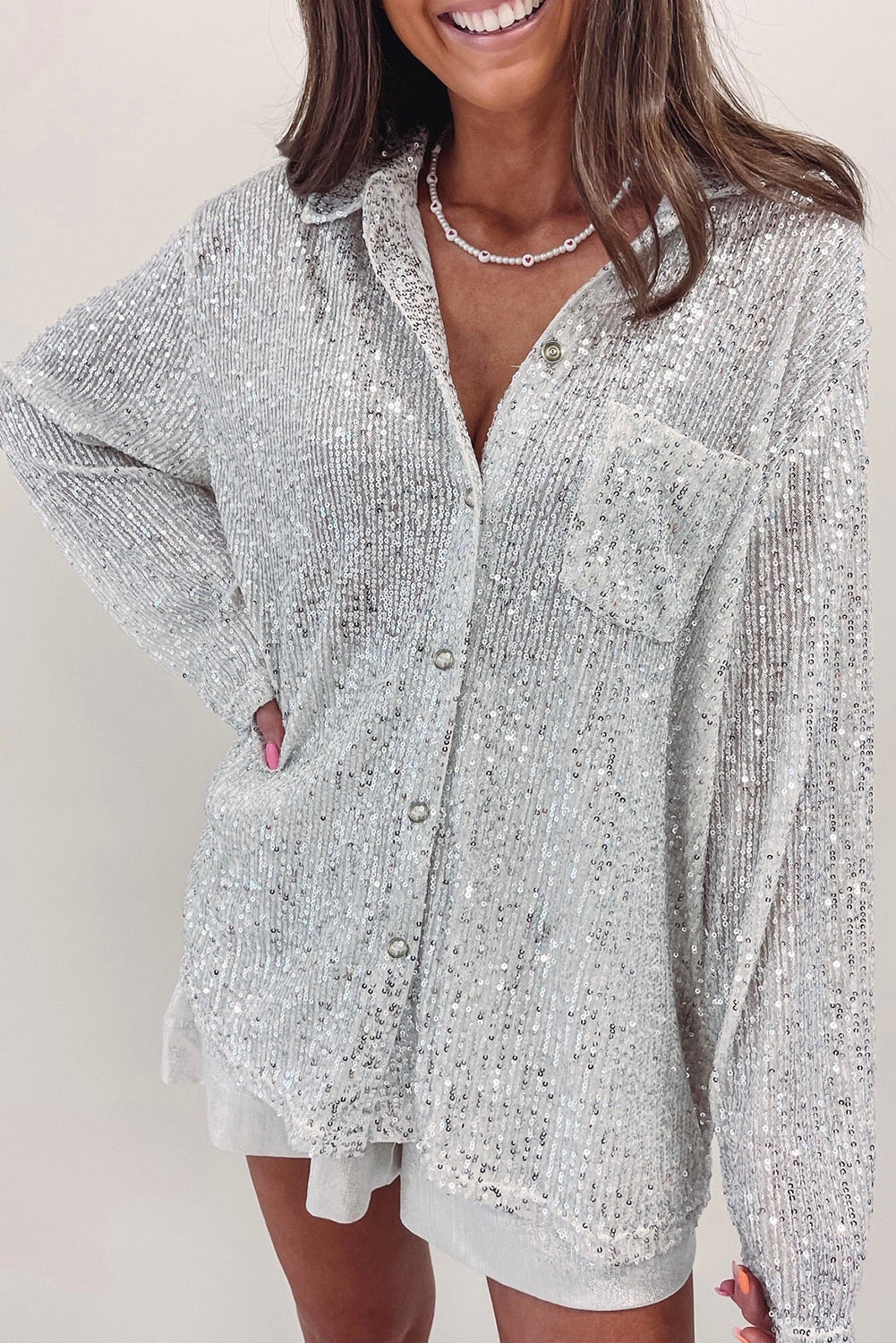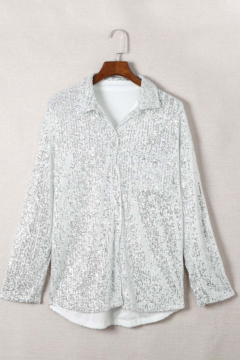 Features sequined shell, button front, turndown collar, and a chest pocket