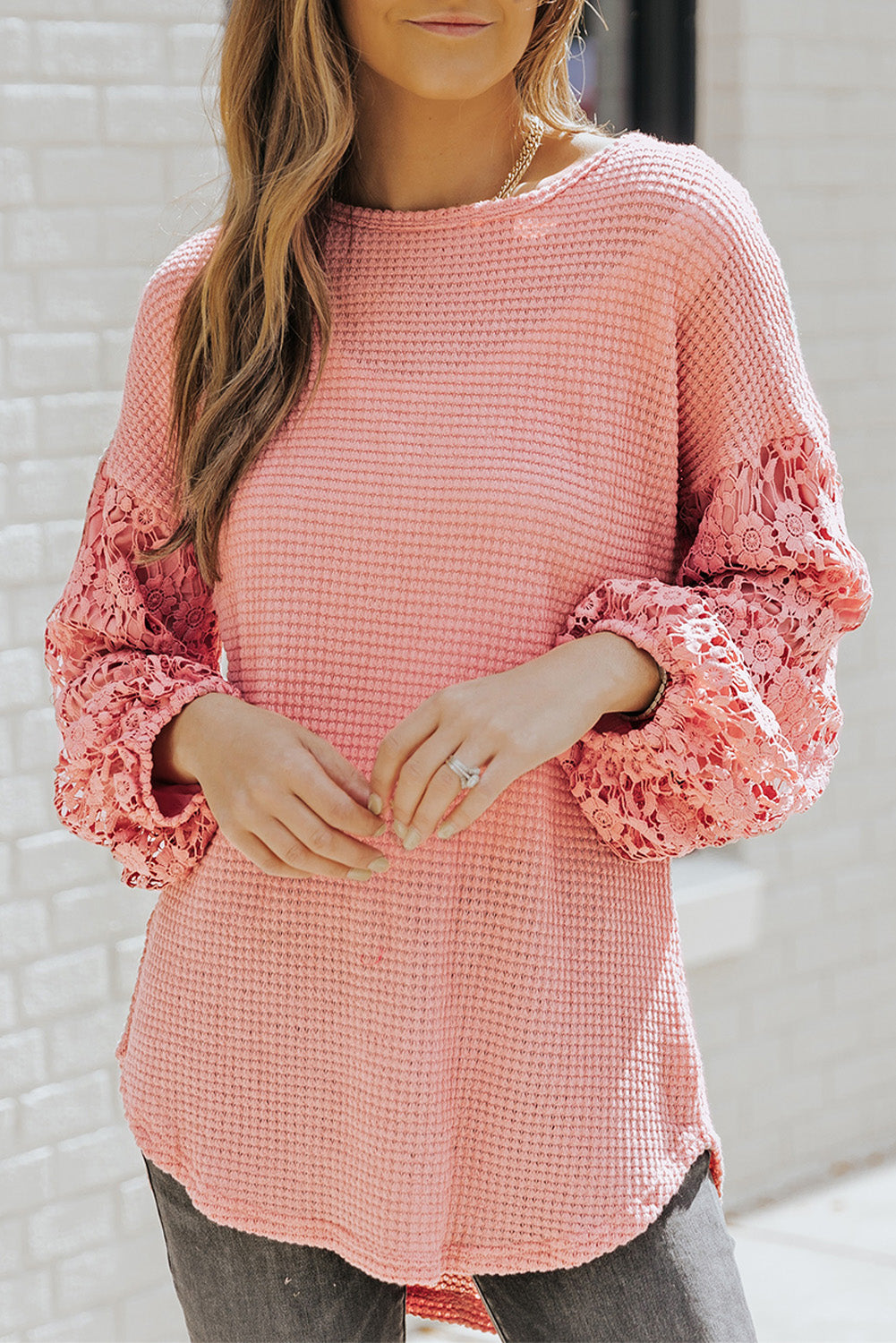 Lace Patchwork Waffle Knit Balloon Sleeve Blouse
