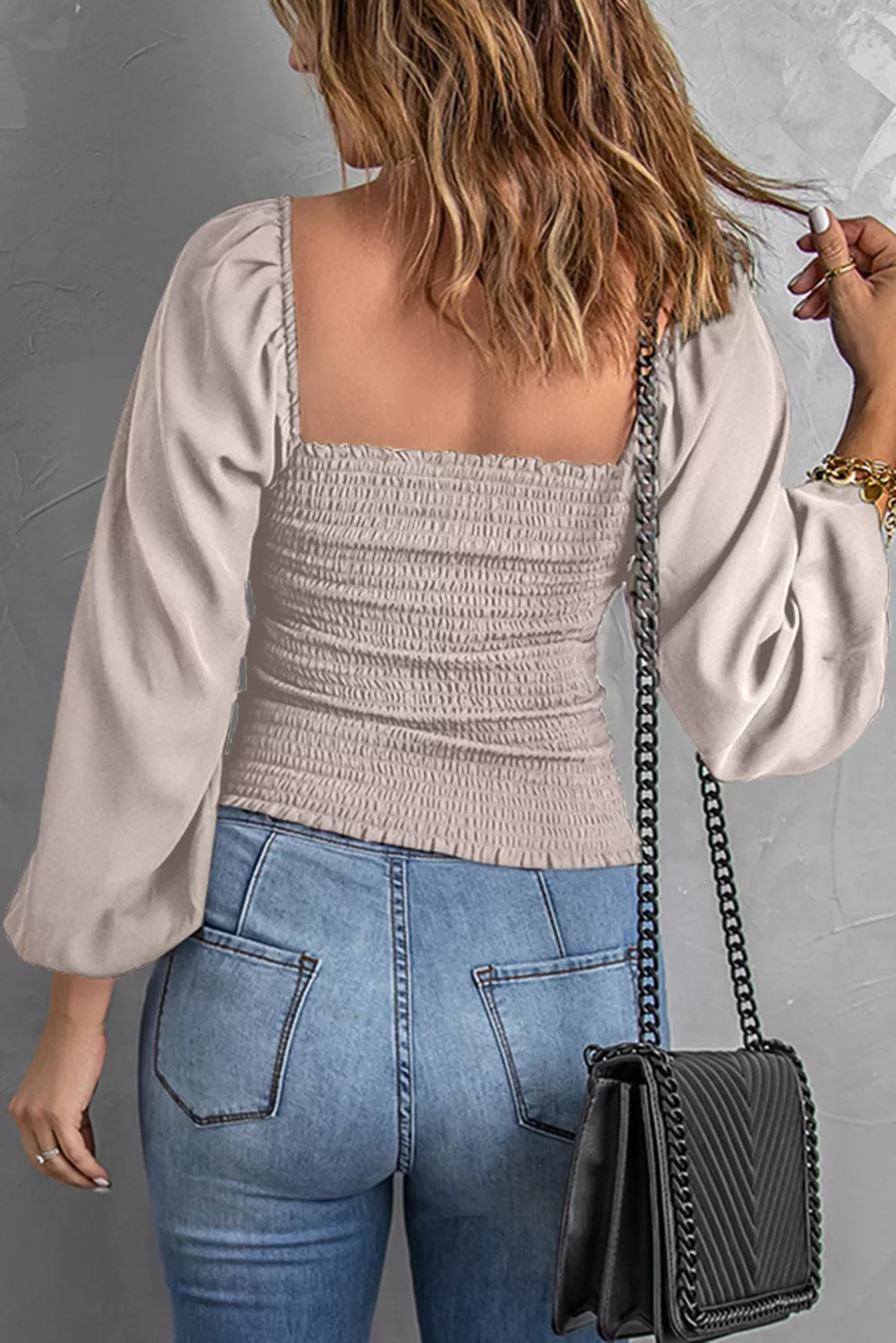 •Tight-fitting top, square neck front and back, puff sleeve, this smocked top is easy to match with both pants and skirts