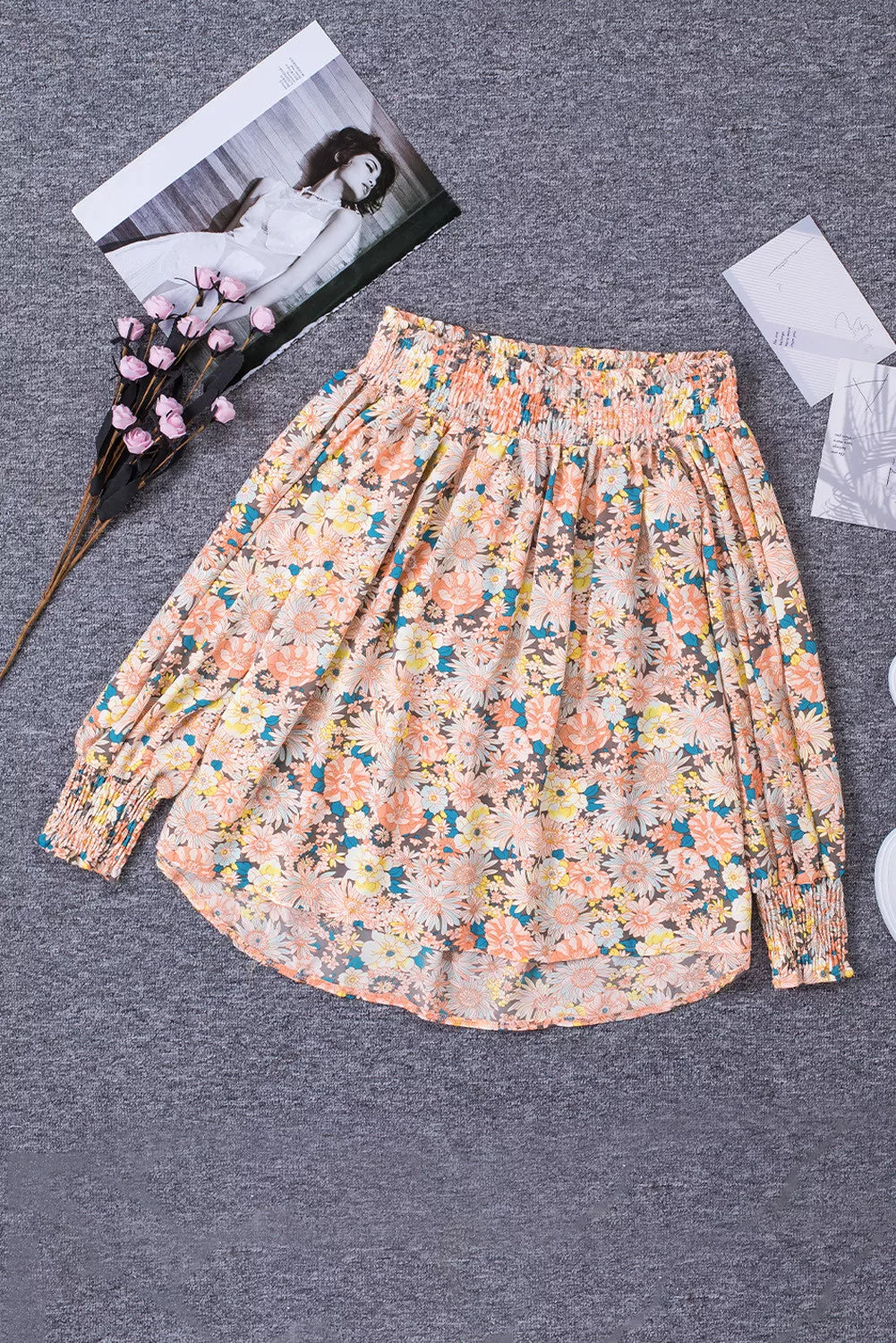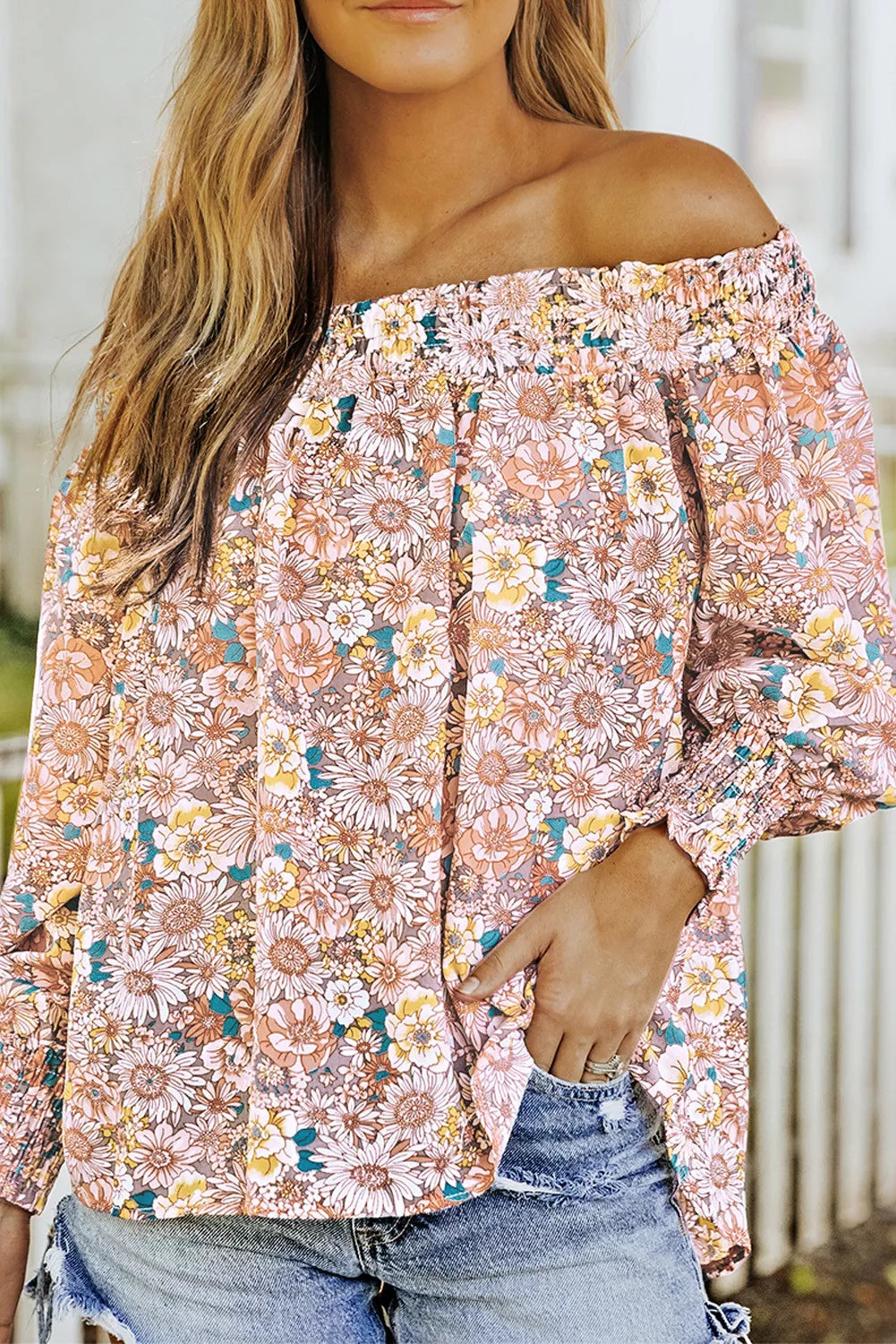 •Off the shoulder top with smocked hem and cuffs fits your body well