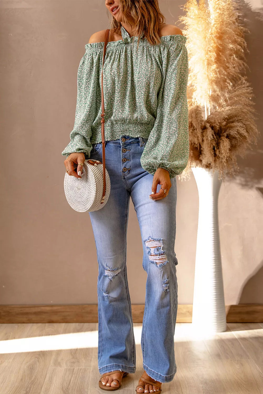 Floral Print Halter Off-shoulder Blouse