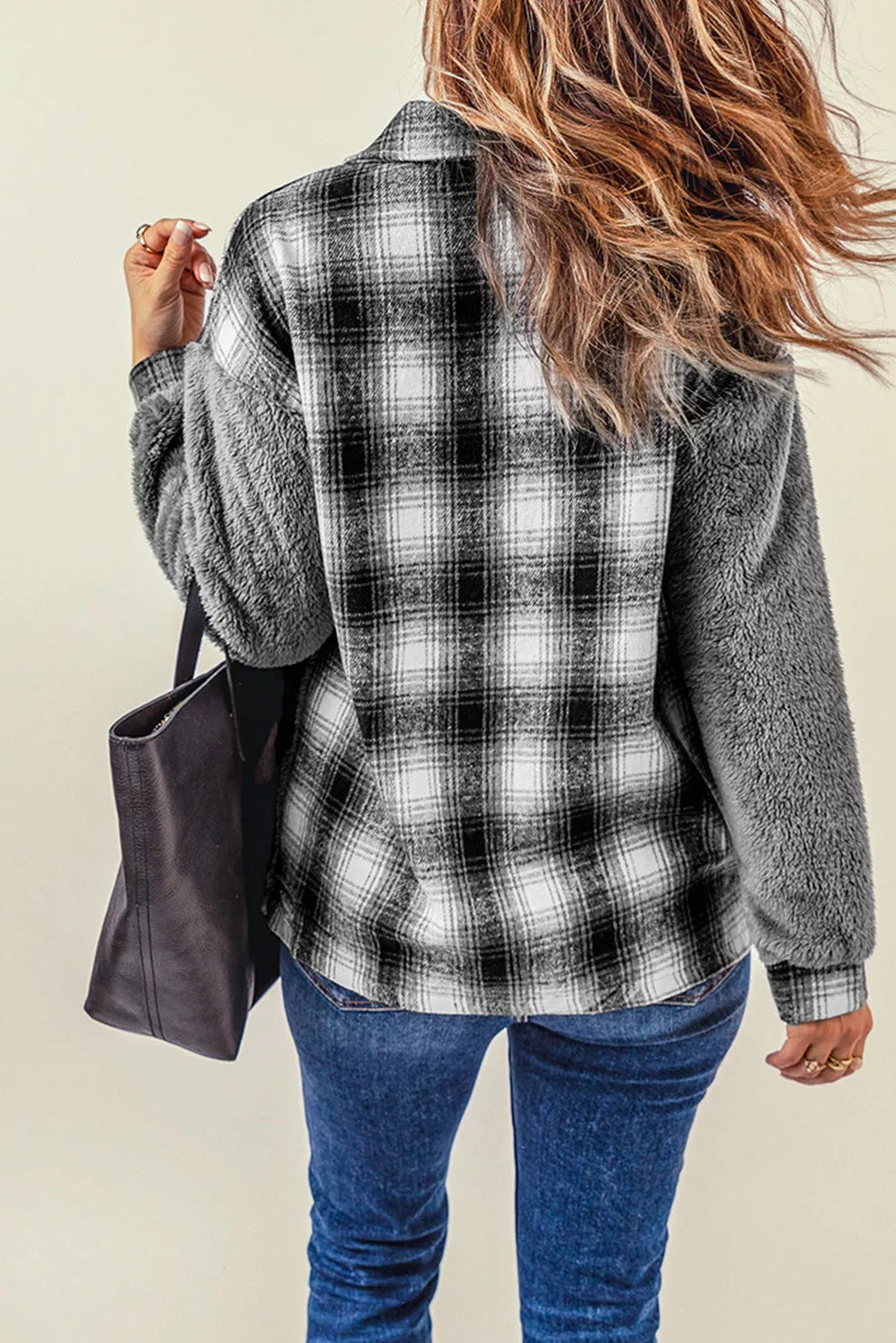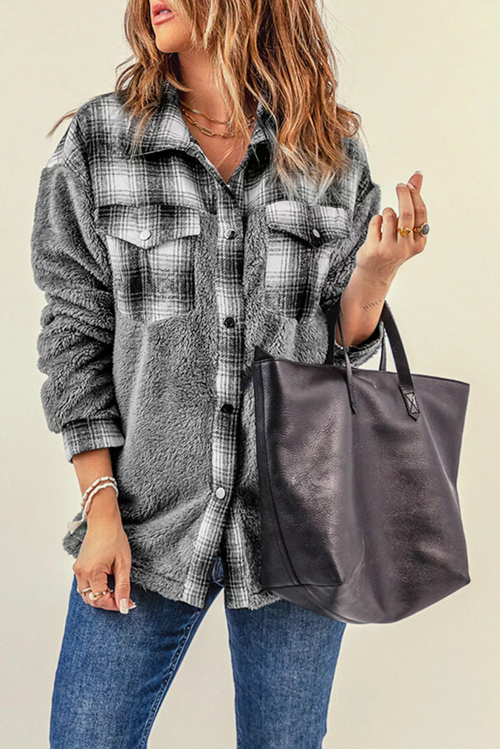 Plaid Patchwork Buttoned Pocket Sherpa Jacket