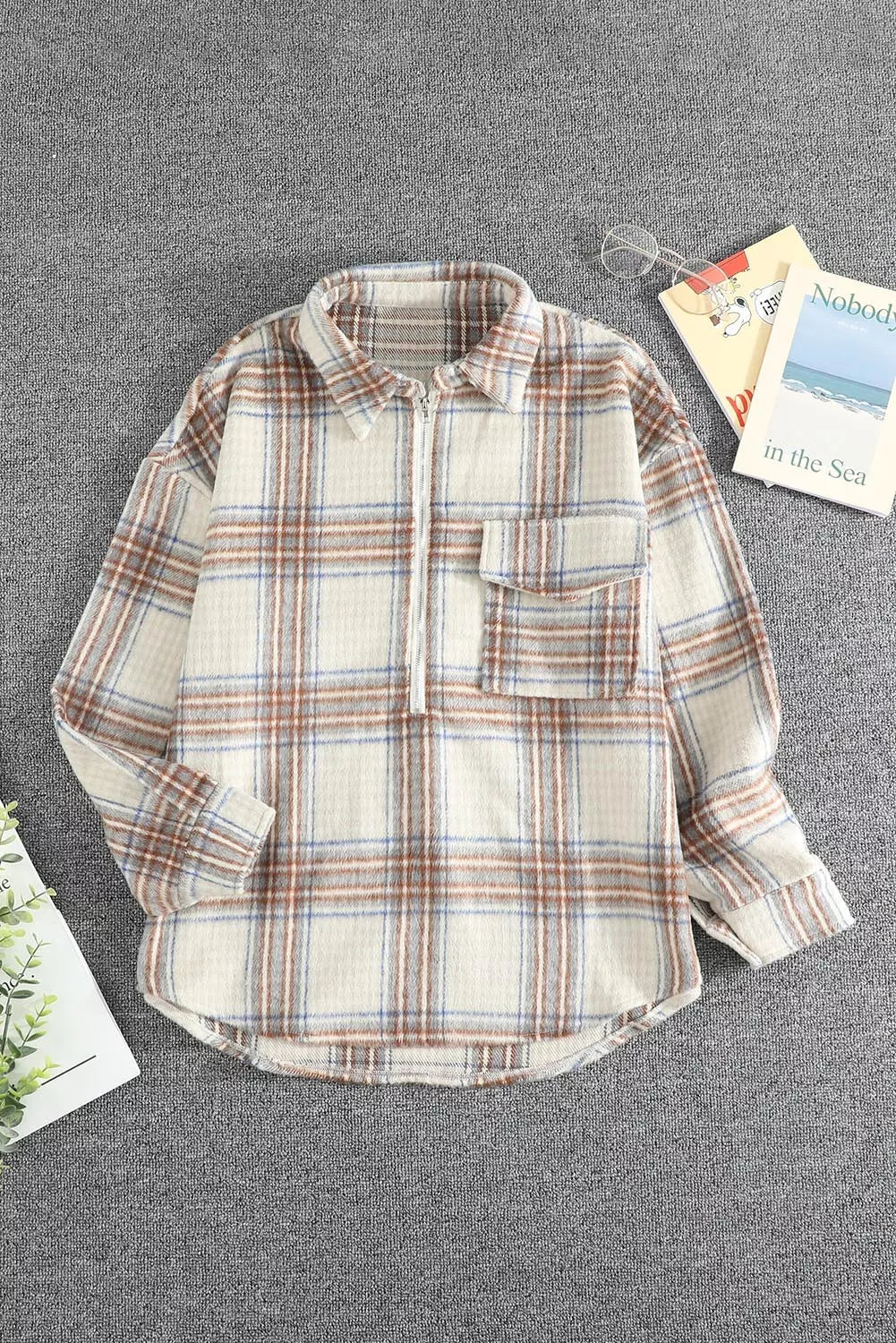•This plaid sweatshirt has an oversized fit and a half zipper closure