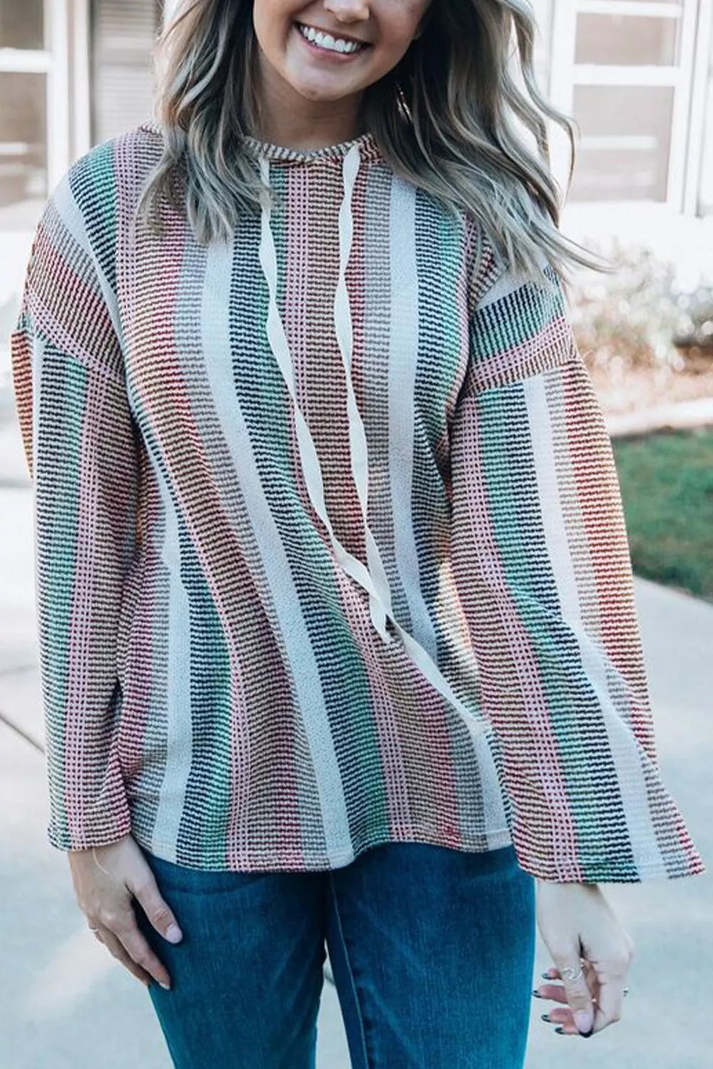 Striped Drop Shoulder Textured Knit Hoodie