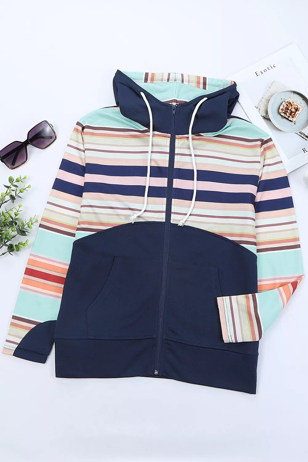 Striped Color Block Thumbhole Sleeve Full Zip Hoodie