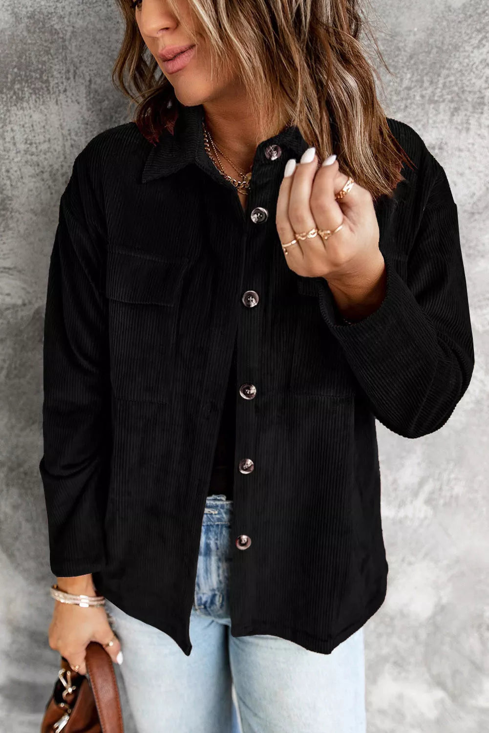•Our Pocketed Button Ribbed Textured Shacket displays a textured, extremely soft fabric front that tucks flawlessly into your favorite denim