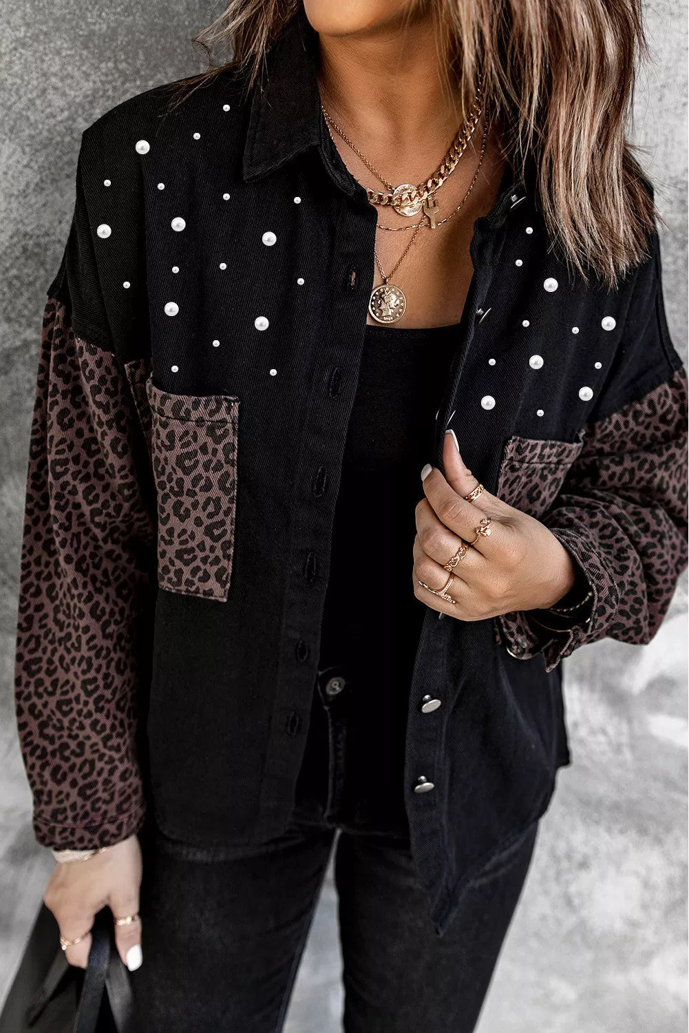 Leopard Patchwork Beaded Chest Pockets Denim Jacket