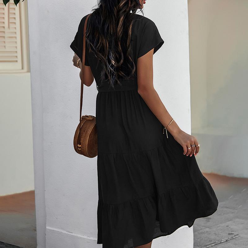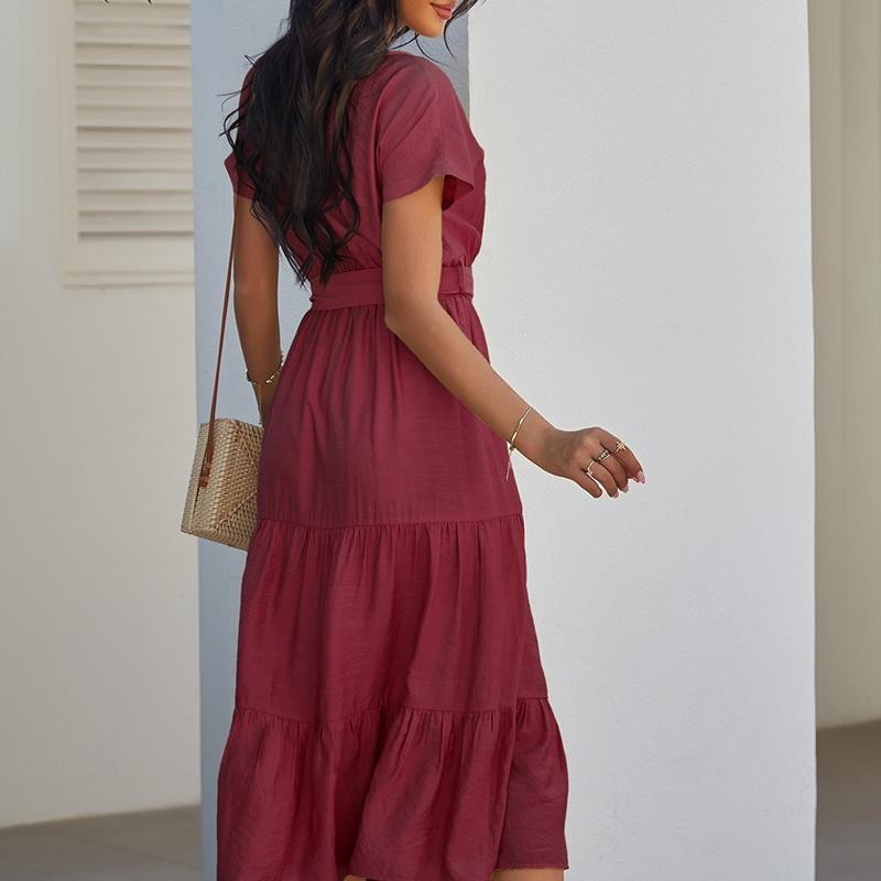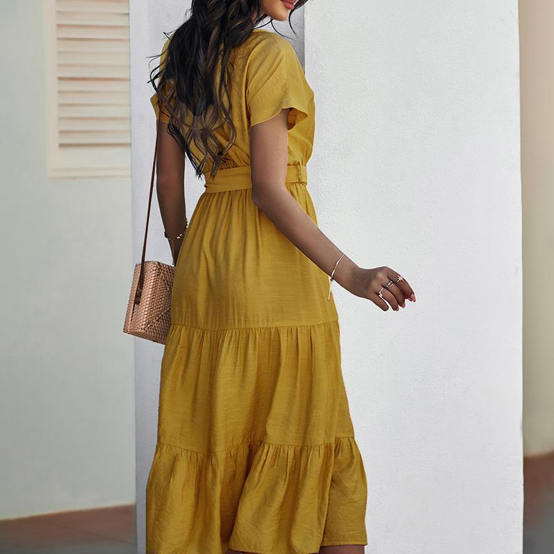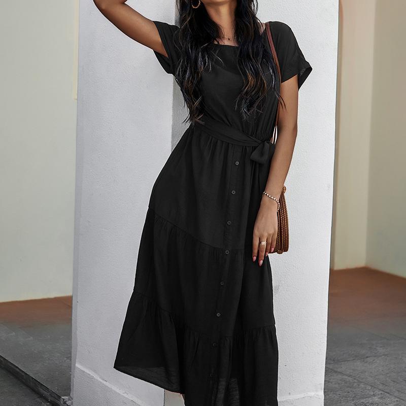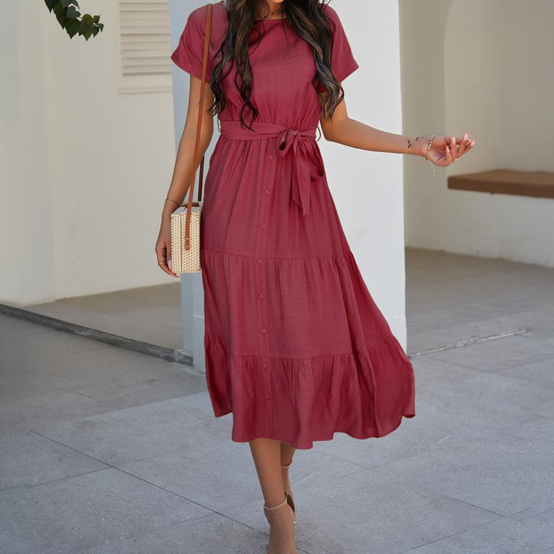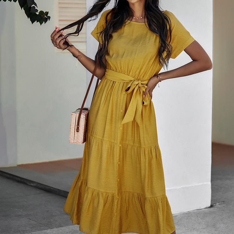 - Spring and summer bundle waist simple solid color dress