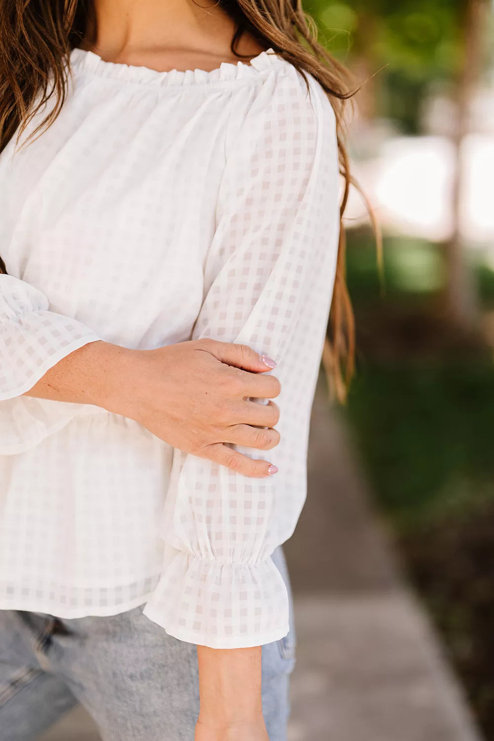 White Lattice Frilled Off Shoulder Cinched Waist Peplum Blouse