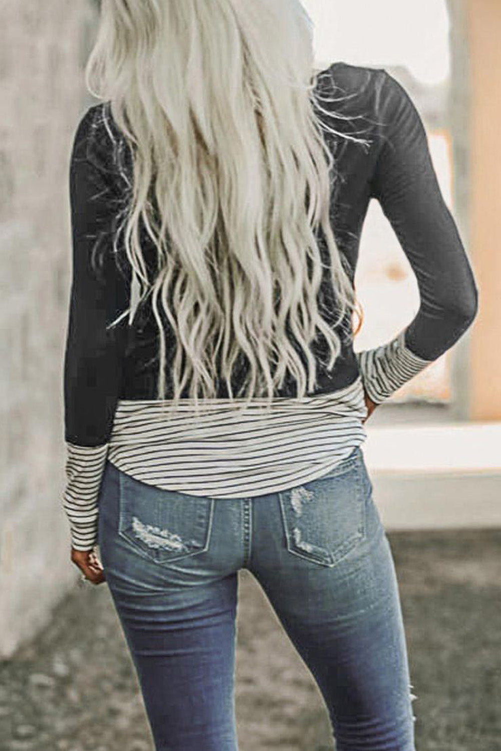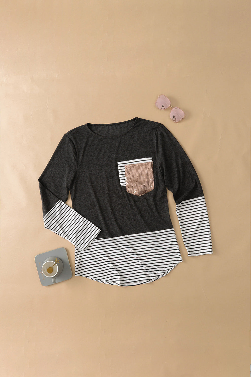 Stripe Pocket Sequins Splicing Long Sleeve O-neck Top