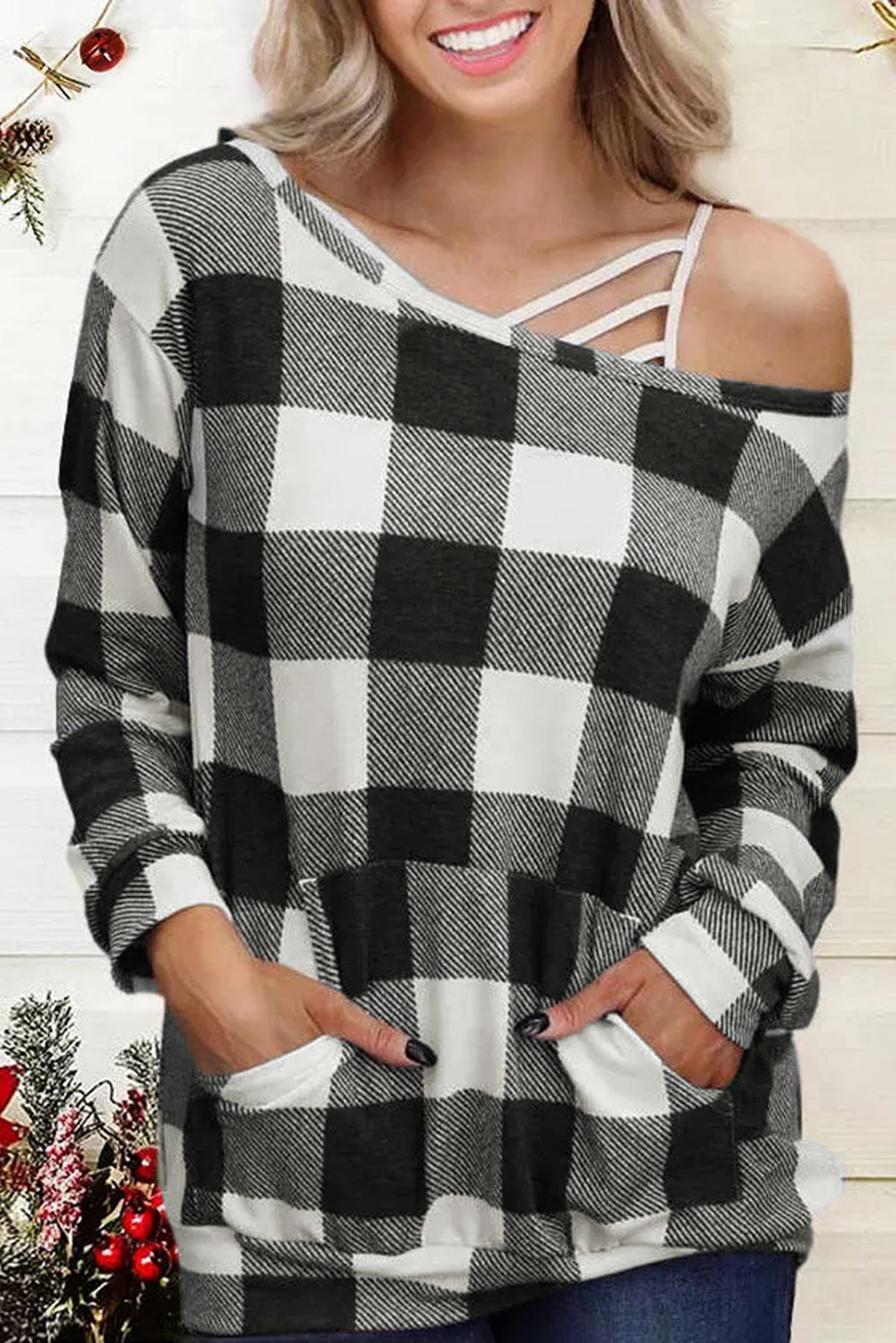 Plaid Kangaroo Pocket Long Sleeve Blouse
