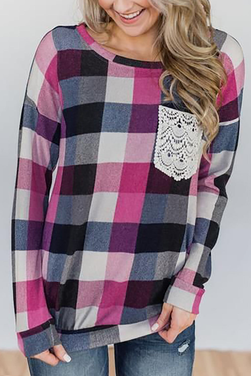 Plaid Print Lace Pocket Long Sleeve Top