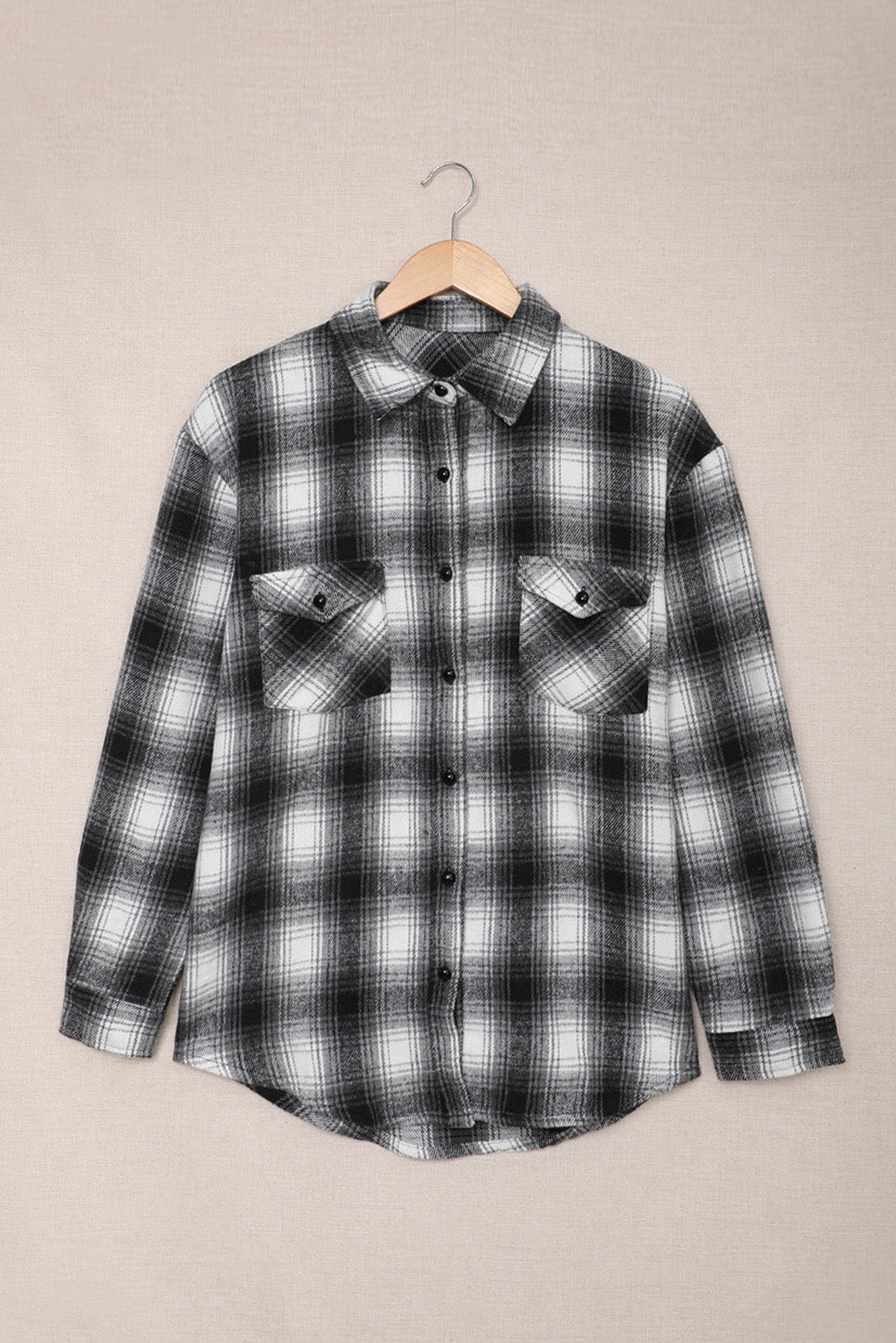 •Plaid shirt with pockets on the front bust, rounded hemline finished