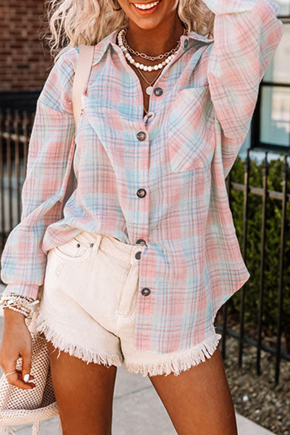 - This women's shirt features lightweight material patterned with a subtle light blue and peach hued plaid print