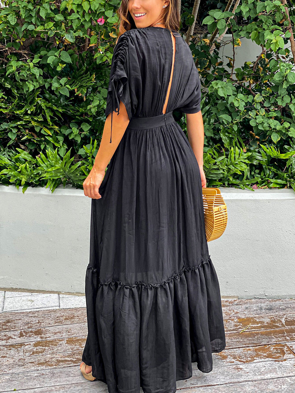 - The Drawstring Pleated Kimono Sleeve Ruffle Maxi Dress is a stunning and elegant piece with a plunge v-neck and slit back
