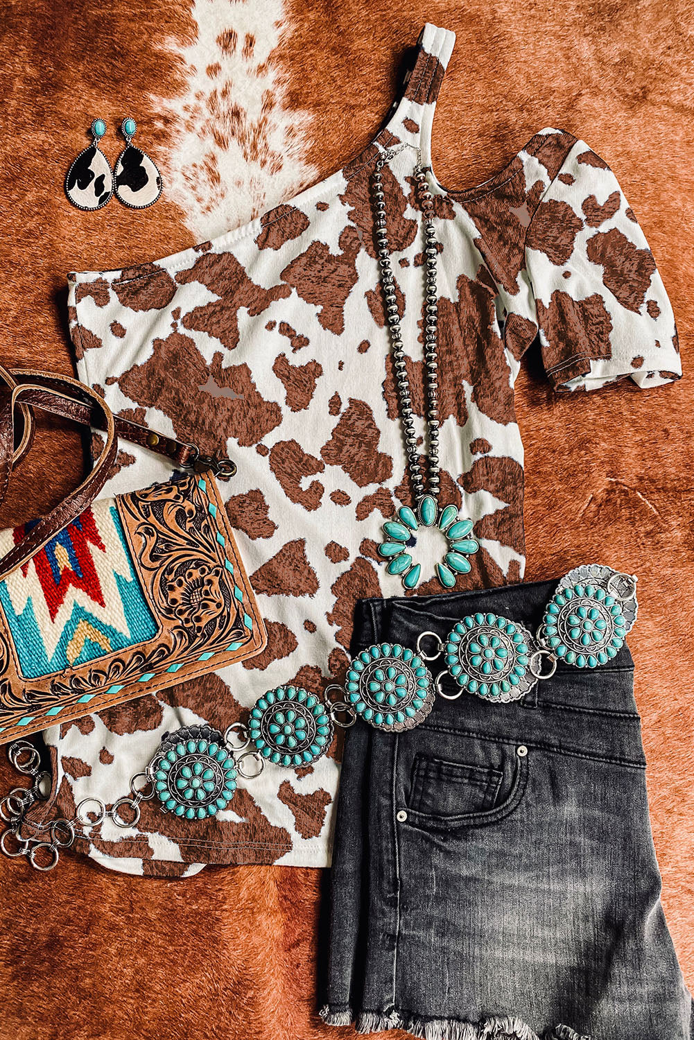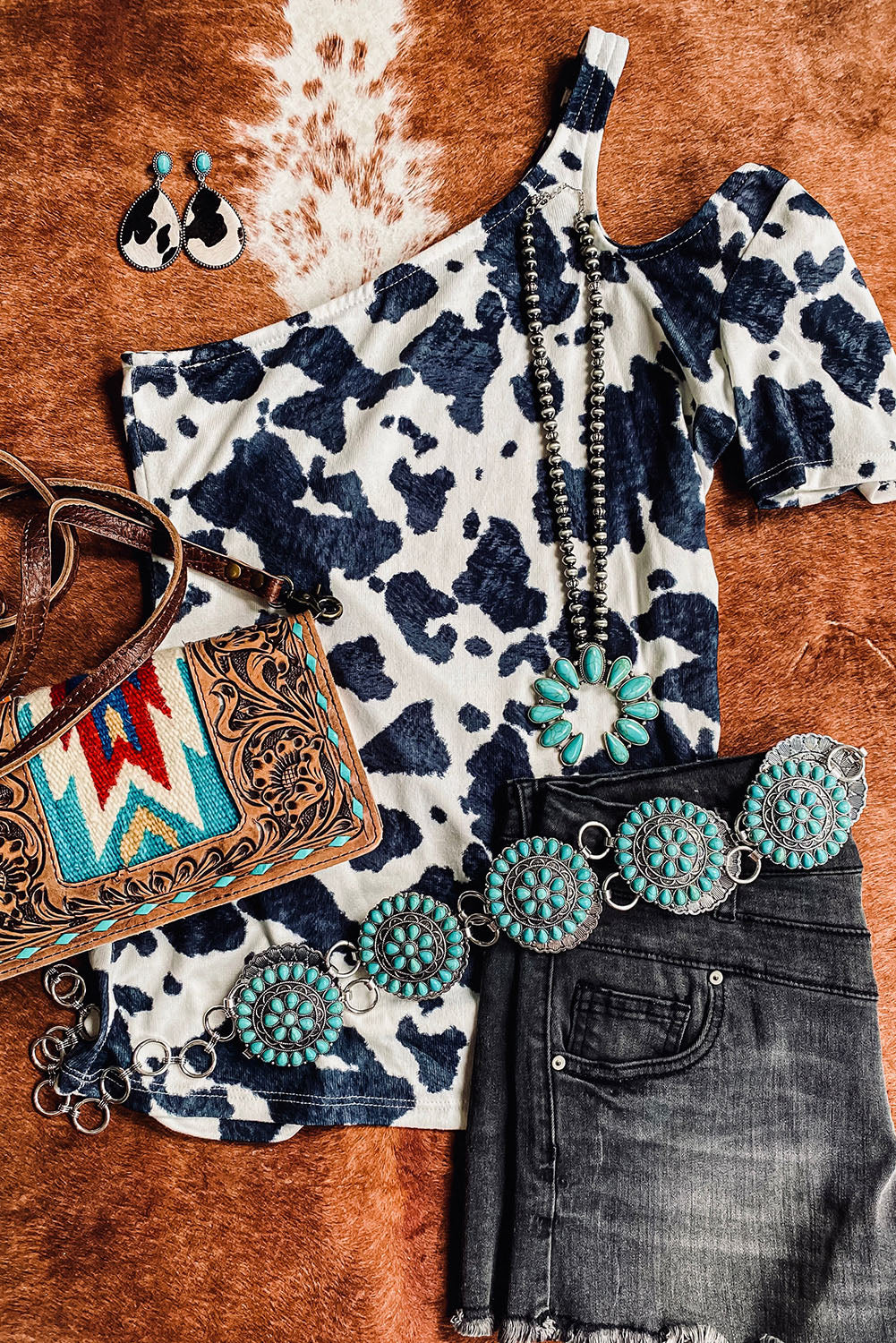 One Shoulder Cow Print Cut out Short Sleeve Top