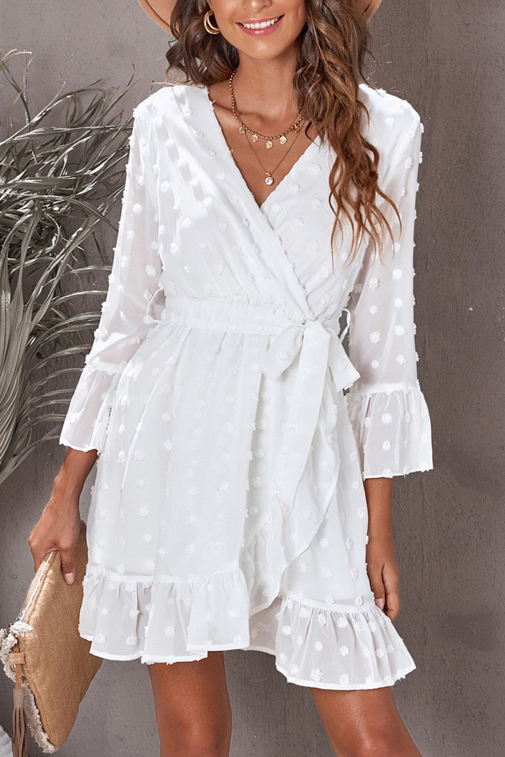 V Neck 3/4 Sleeve Belted Swiss Dot Mini Dress