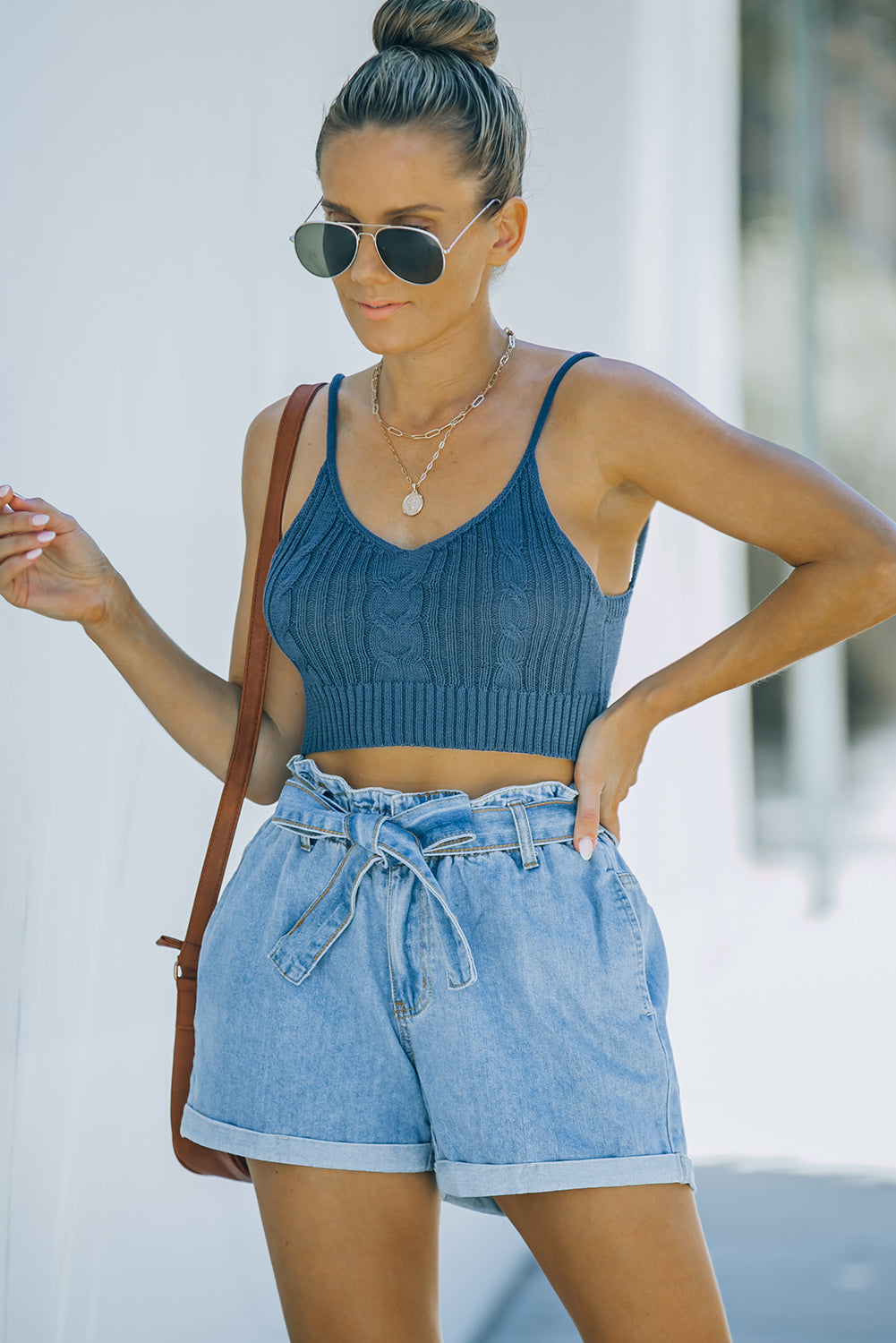 Blue Cable Knit Crop Top with Ribbed Hem