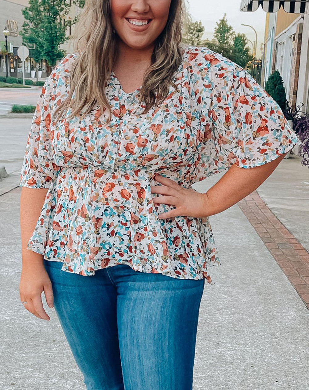 Apricot Plus Size Floral Print V Neck Peplum Blouse