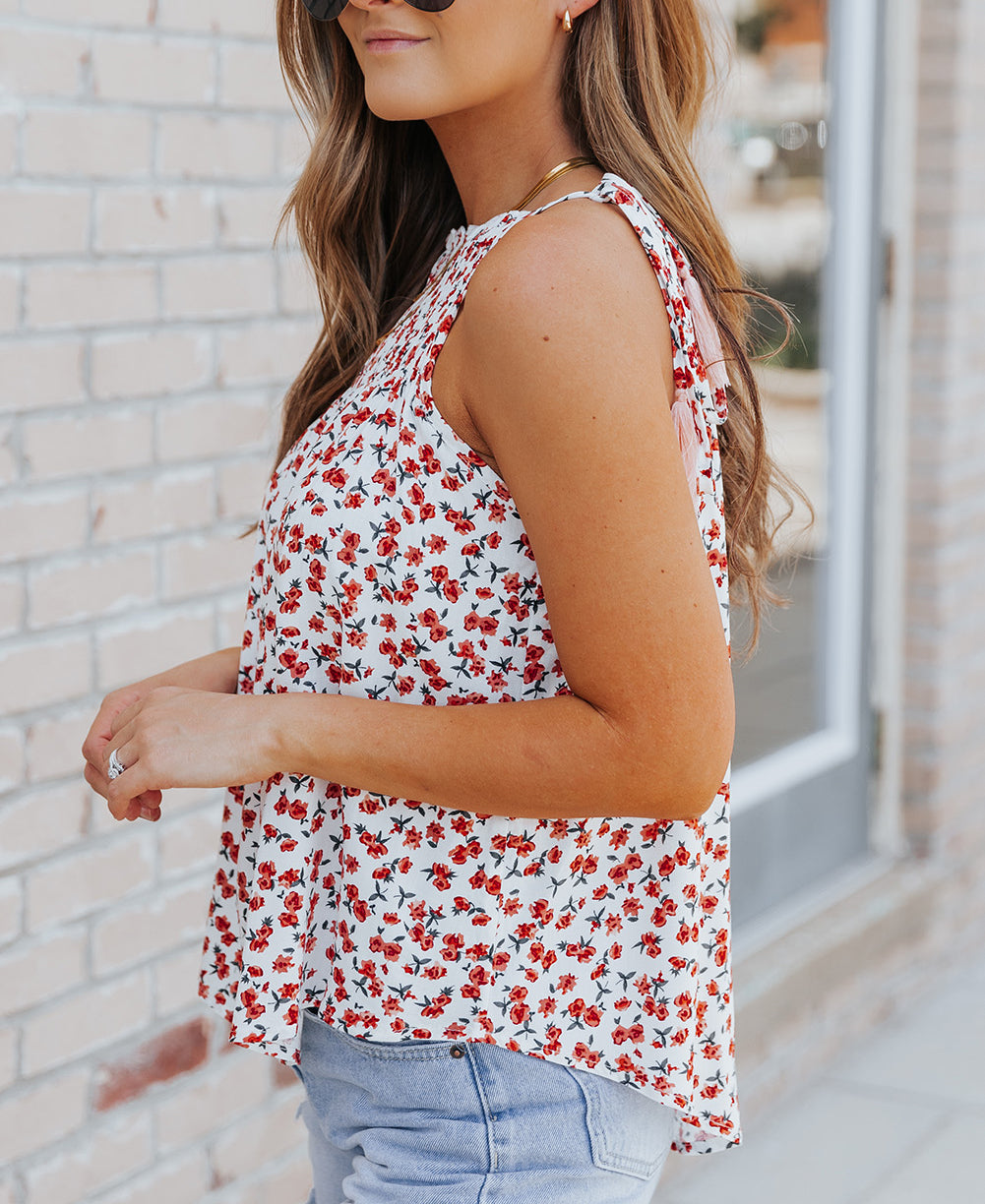 Floral Print Tassel Drawstring Lace-up Tank Top