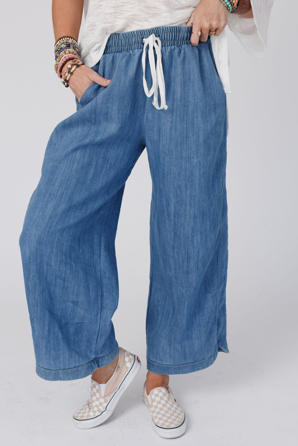 Sky Blue Wide Leg Drawstring Waist Loose Pants