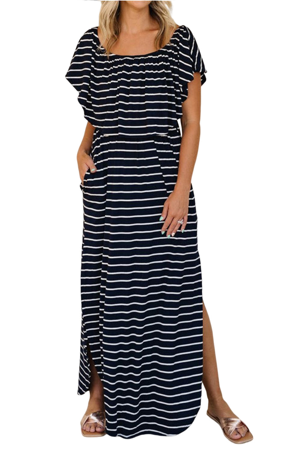 Blue Striped Print Ruffled High Waist Maxi Dress with Side Splits