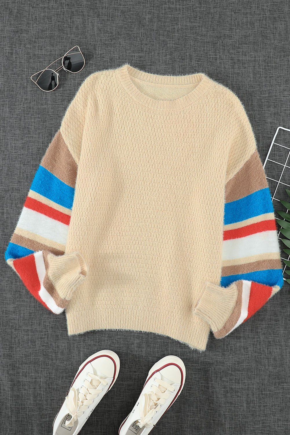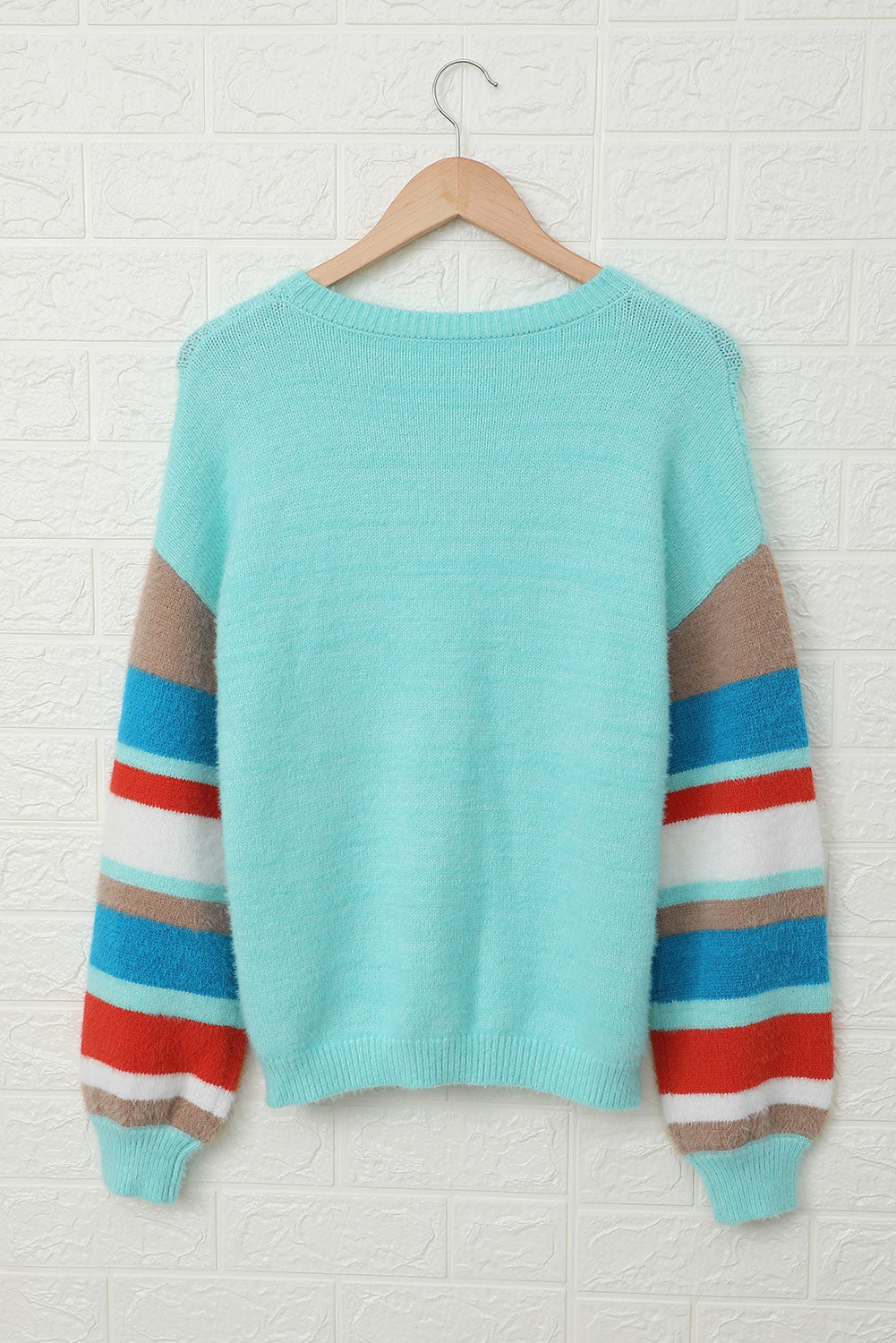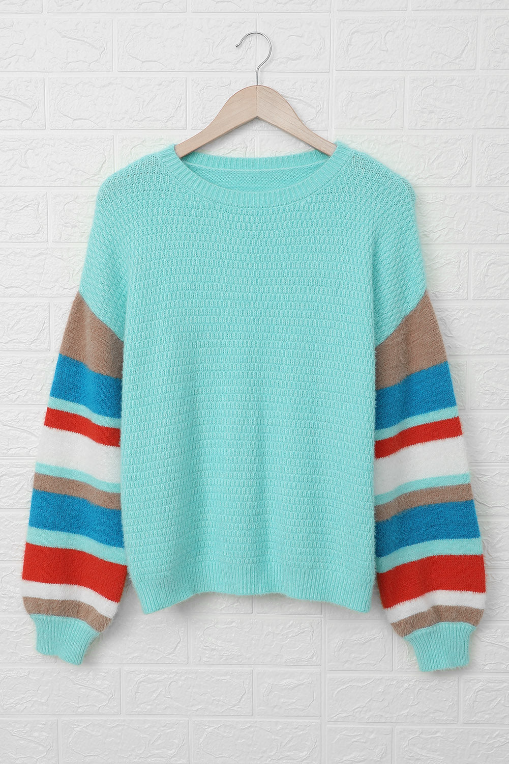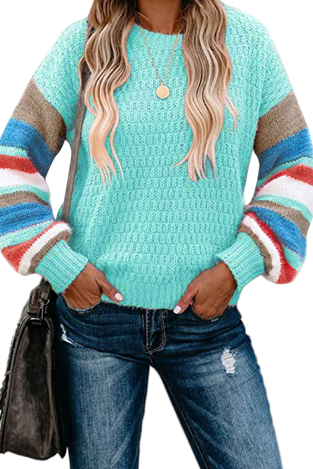 Crew Neck Lantern Sleeve Striped Color Block Sweater