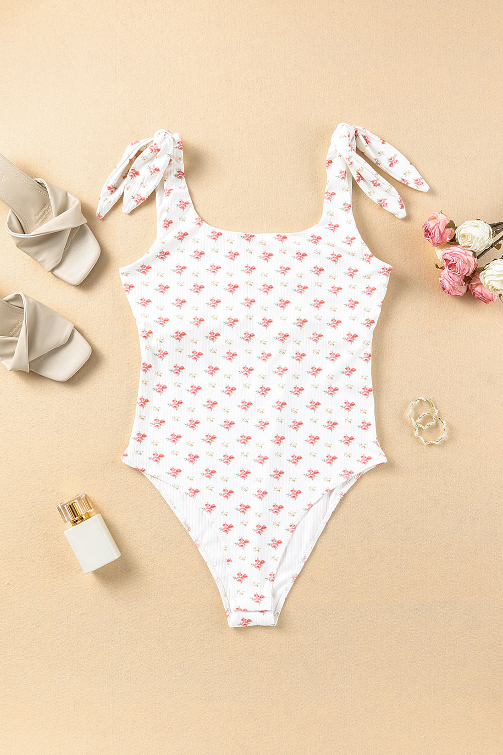 Floral Print Lace-up Straps Ribbed Square Neck Tank Top