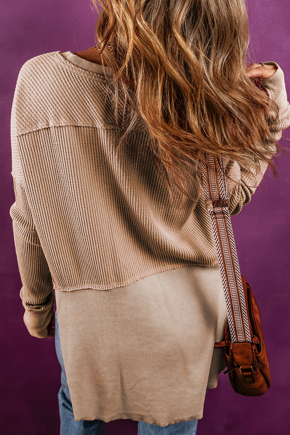 Exposed Seam Slit Neck Waffle Knit Patchwork Top