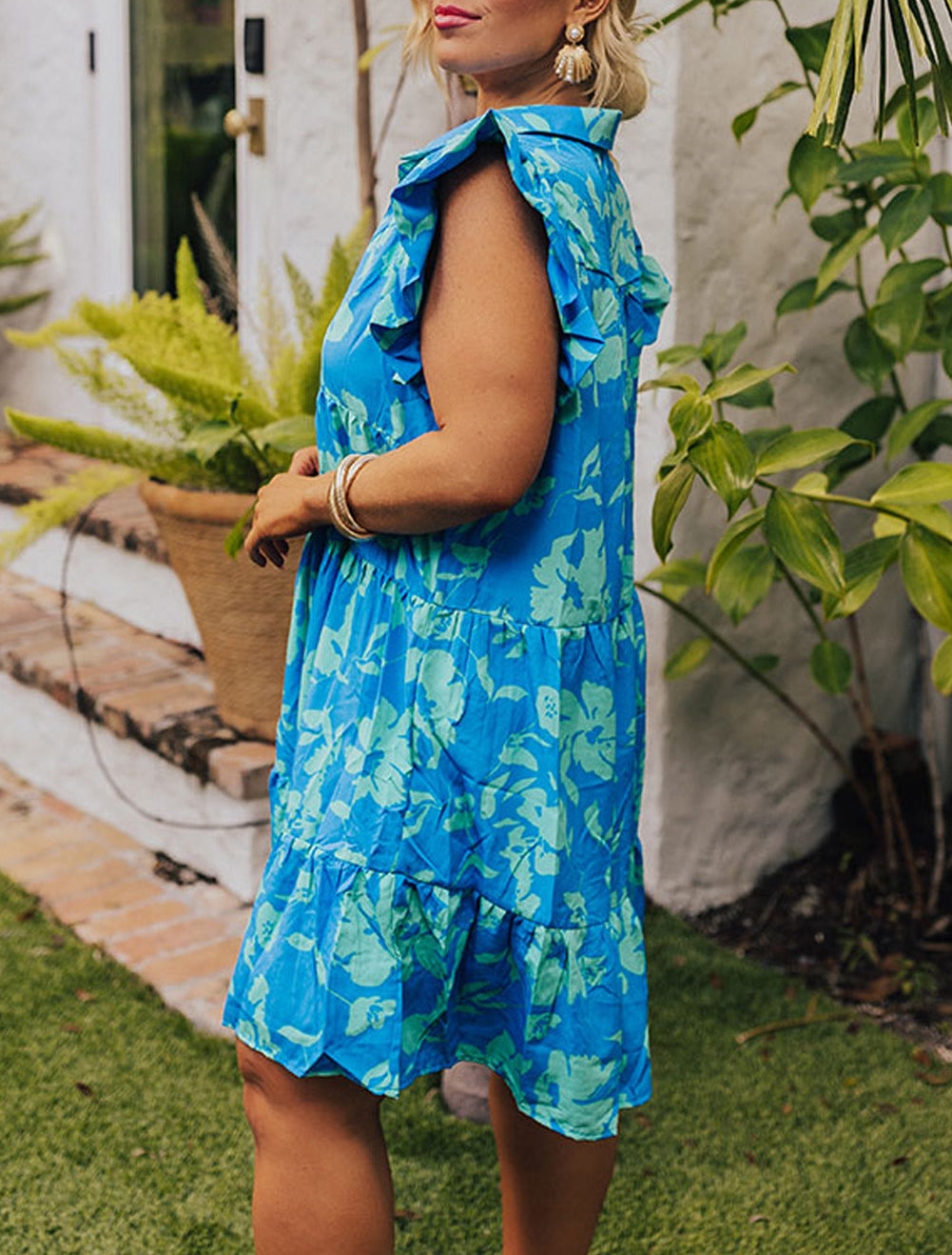 Plus Size Floral Print Flutter Sleeve Buttoned Mini Dress