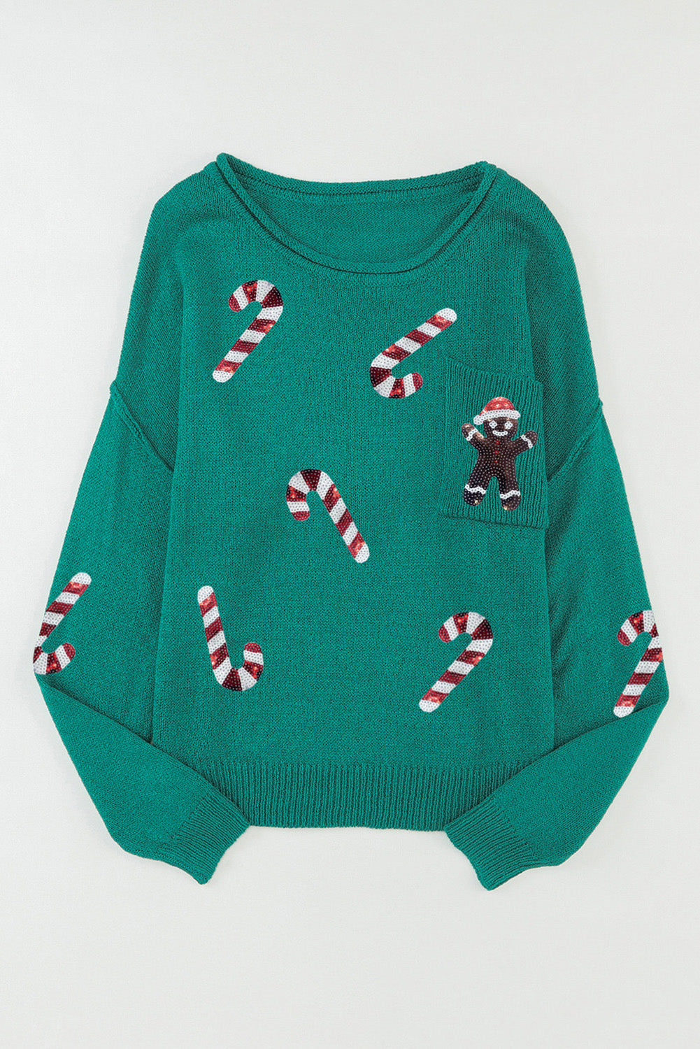 - Sequined candy canes on the front and a gingerbread man on the pocket