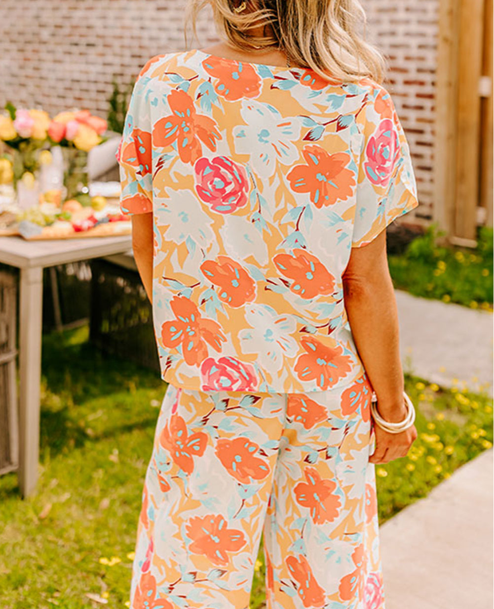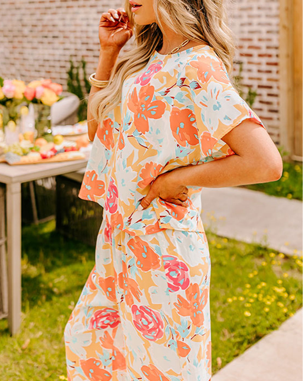 Floral Printed Short Sleeve Top 2 Piece Pants Set