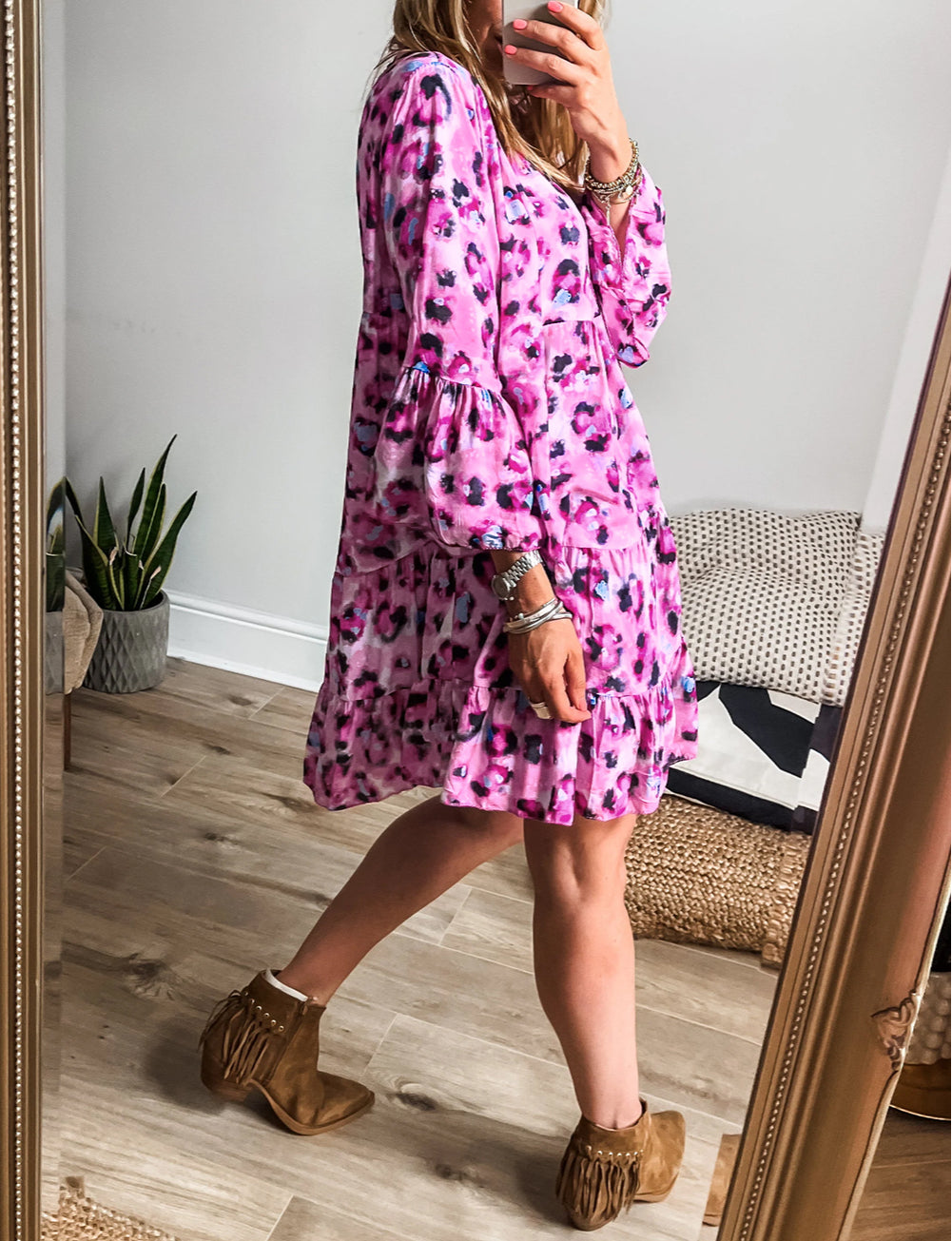 Leopard Print Buttoned Front 3/4 Sleeve Tiered Ruffled Hem Dress