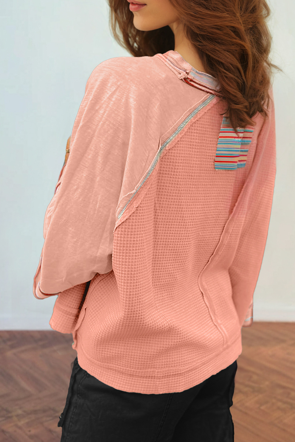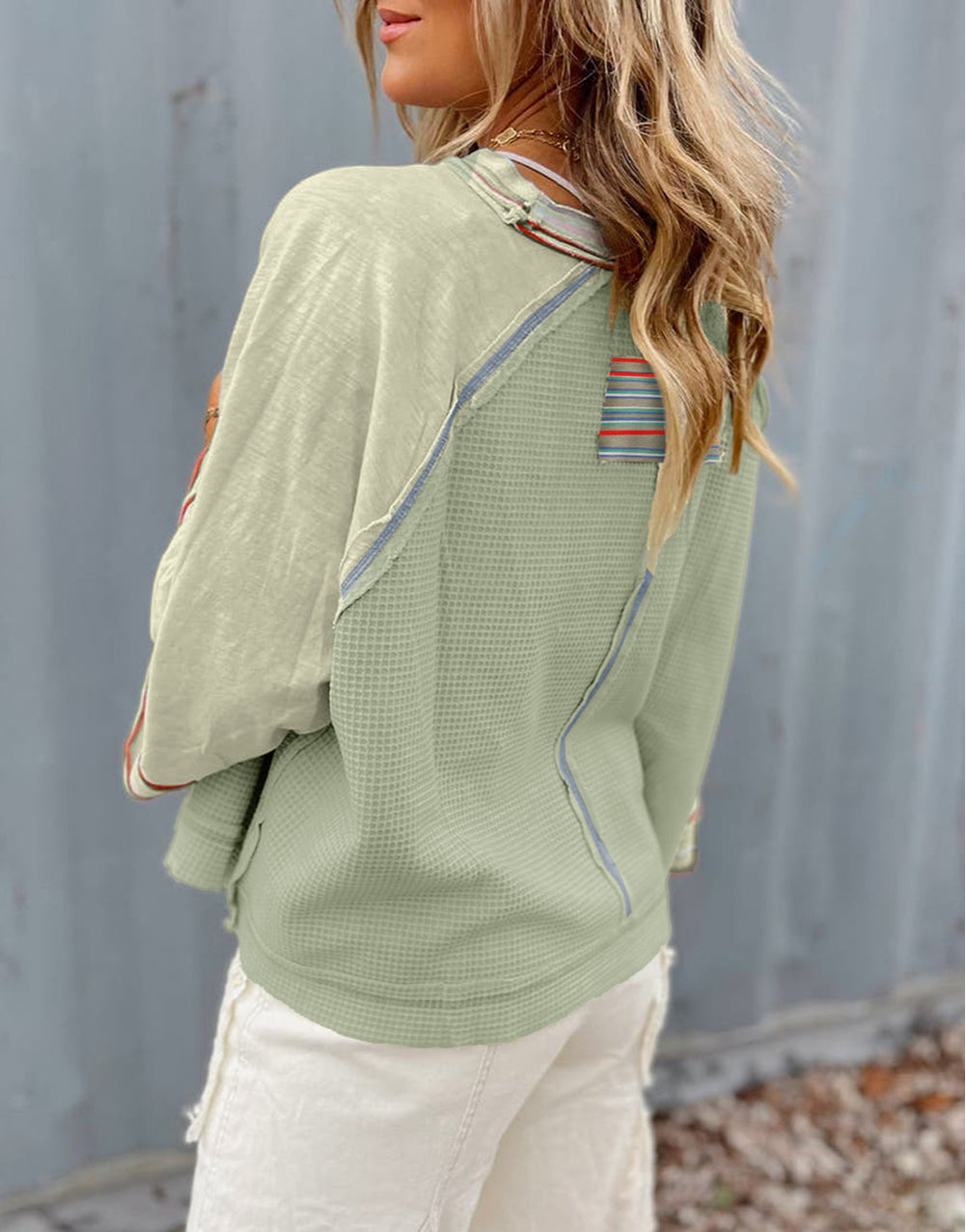 Waffle Knit Wide Bracelet Sleeve Patchwork Raglan Top