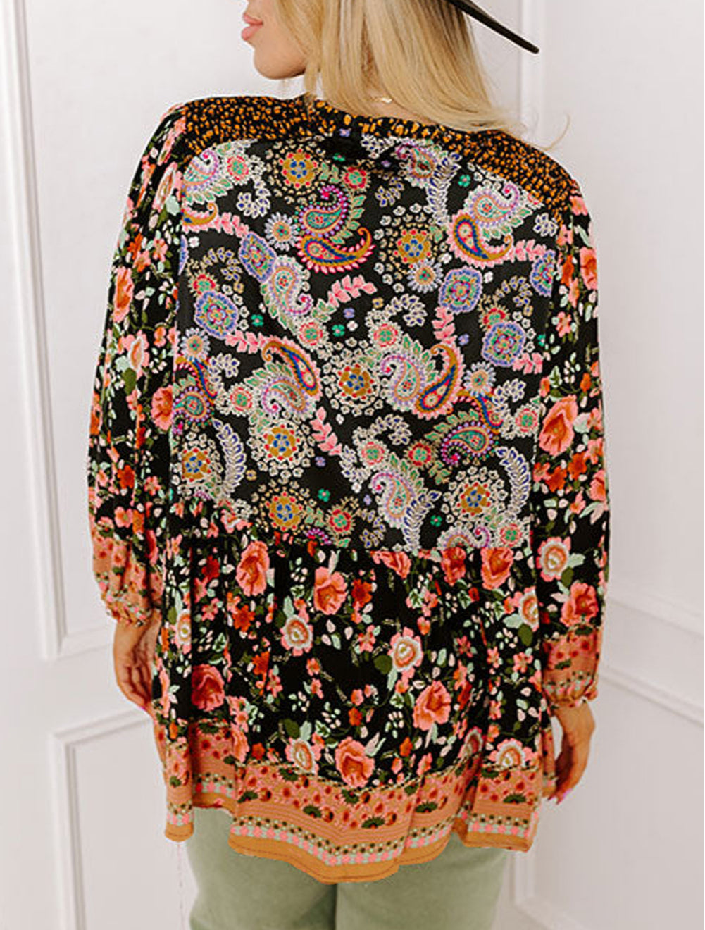Plus Size Paisley Floral Print V Neck Bubble Sleeve Blouse