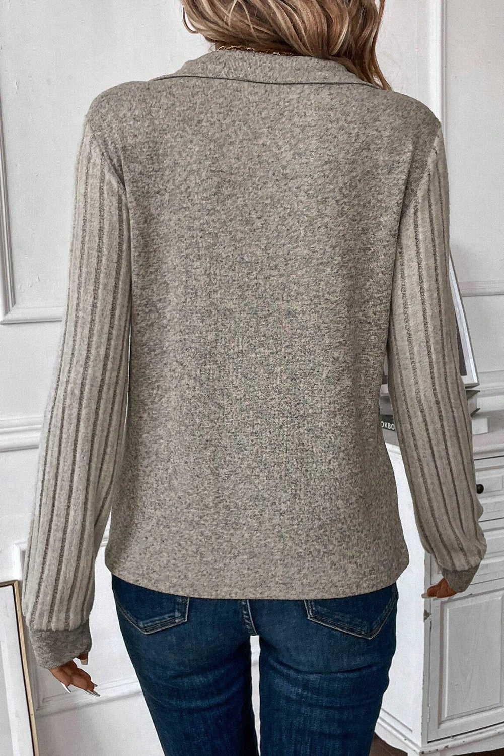Solid Color Ribbed Sleeve Collared V Neck Top