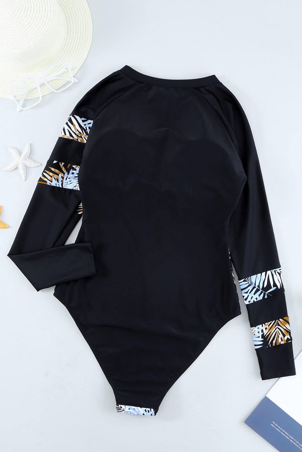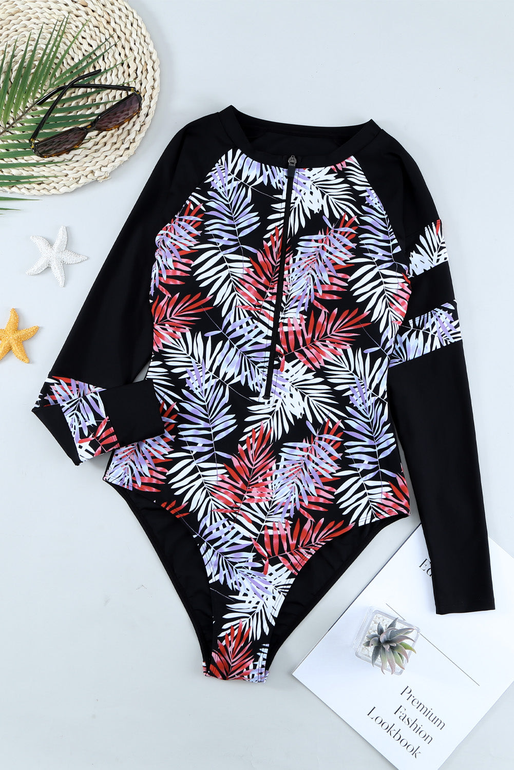 Leaves Print Zip-up Long Sleeve Surf Rash Guard Swimwear
